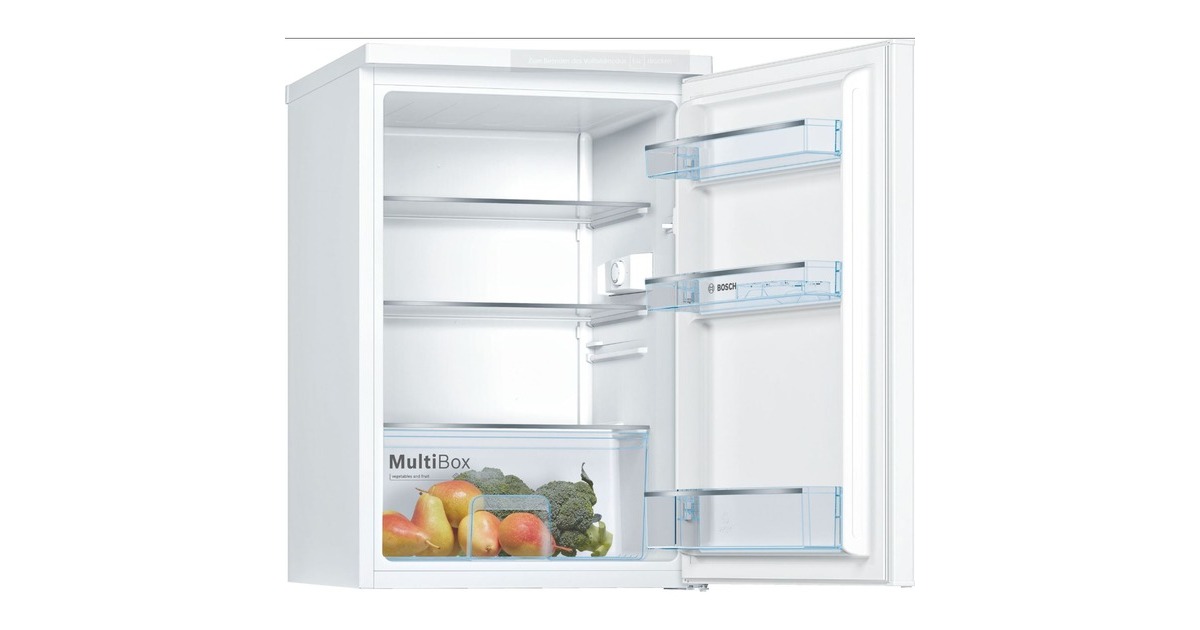Der Kühlschrank Bosch KTR15NWEA ist mit einem Gesamtnutzinhalt von 134 Litern ideal für den Single-Haushalt geeignet. Er stellt drei Abstellflächen aus Sicherheitsglas, davon eine höhenverstellbar, eine transparente MultiBox mit Wellenboden für Obst und Gemüse sowie drei Türfächer zur Verfügung. Die Temperaturregelung erfolgt mechanisch über einen Drehwähler. Mit einem Stromverbrauch von 91 kWh im Jahr ist der KTR15NWEA in die Energieeffizienzklasse E eingestuft.Art.-Nr.: 1660380