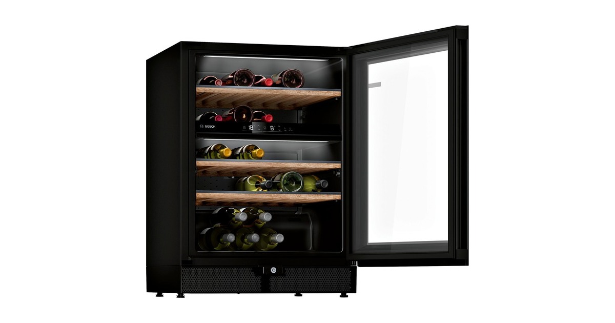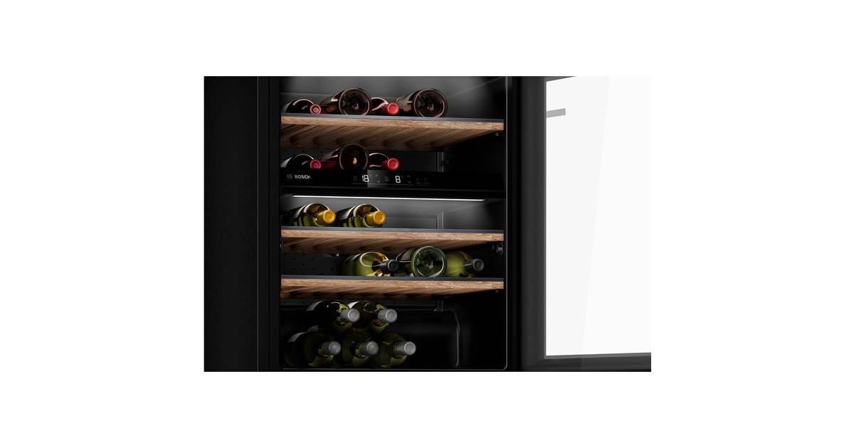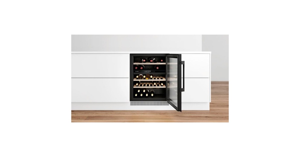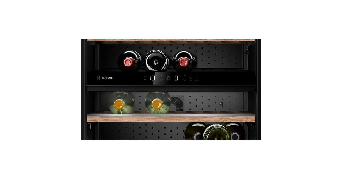 Der Weinkühlschrank Bosch KWK16ABGB verfügt über zwei separate Temperaturzonen, die je nach Bedarf flexibel auf die ideale Trinktemperatur zwischen +5 °C und +20 °C eingestellt werden können – für vollmundige Rotweine und fruchtige Weißweine. Dank der fünf Ablageflächen, davon drei hochwertige Eichenregale, ist die gesuchte Flasche Wein stets griffbereit und der Teleskopauszug schützt dabei vor Stößen und Erschütterungen. Der KWK16ABGA bietet auf 120 Litern Nutzinhalt Platz für bis zu 44 Bordeaux-Weinflaschen á 0,75 Liter, die dank der Glastür und dem LED-Präsentationsmodus perfekt in Szene gesetzt werden können. Das Türschloss schützt dabei vor unbefugtem Zugriff und die Kindersicherung verhindert ein Verstellen der gewählten Temperatur. Ein Innenventilator sorgt zudem für eine optimale Kälteverteilung. Mit einem Stromverbrauch von 142 kWh im Jahr ist der KWK16ABGB in die Energieeffizienzklasse G eingestuft.Art.-Nr.: 100021049