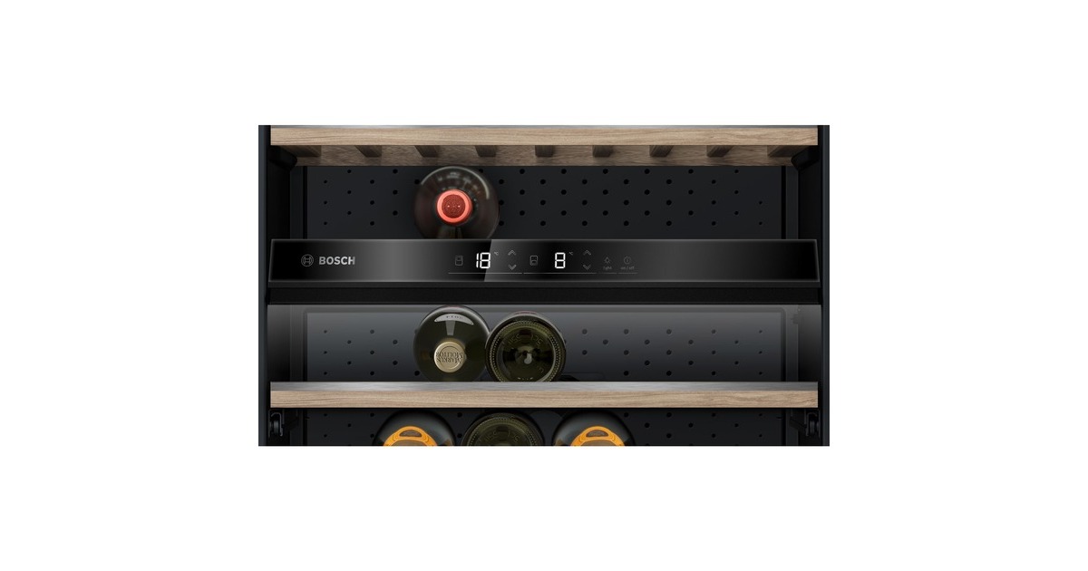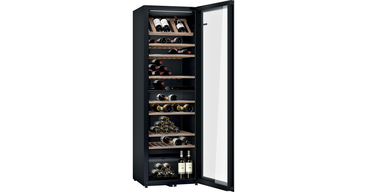 Der Weinkühlschrank Bosch KWK36ABGA verfügt über zwei separate Temperaturzonen, die je nach Bedarf flexibel auf die ideale Trinktemperatur zwischen +7 °C und +19 °C eingestellt werden können – für vollmundige Rotweine und fruchtige Weißweine. Dank der acht hochwertigen Eichenregale ist die gesuchte Flasche Wein stets griffbereit und der Teleskopauszug schützt dabei vor Stößen und Erschütterungen. Der KWK36ABGA bietet auf 370 Litern Nutzinhalt Platz für bis zu 199 Bordeaux-Weinflaschen á 0,75 Liter, die dank der Glastür und dem LED-Präsentationsmodus perfekt in Szene gesetzt werden können. Das Türschloss schützt dabei vor unbefugtem Zugriff und die Kindersicherung verhindert ein Verstellen der gewählten Temperatur. Ein Innenventilator sorgt zudem für eine optimale Kälteverteilung. Mit einem Stromverbrauch von 155 kWh im Jahr ist der KWK36ABGA in die Energieeffizienzklasse G eingestuft.Art.-Nr.: 1829857