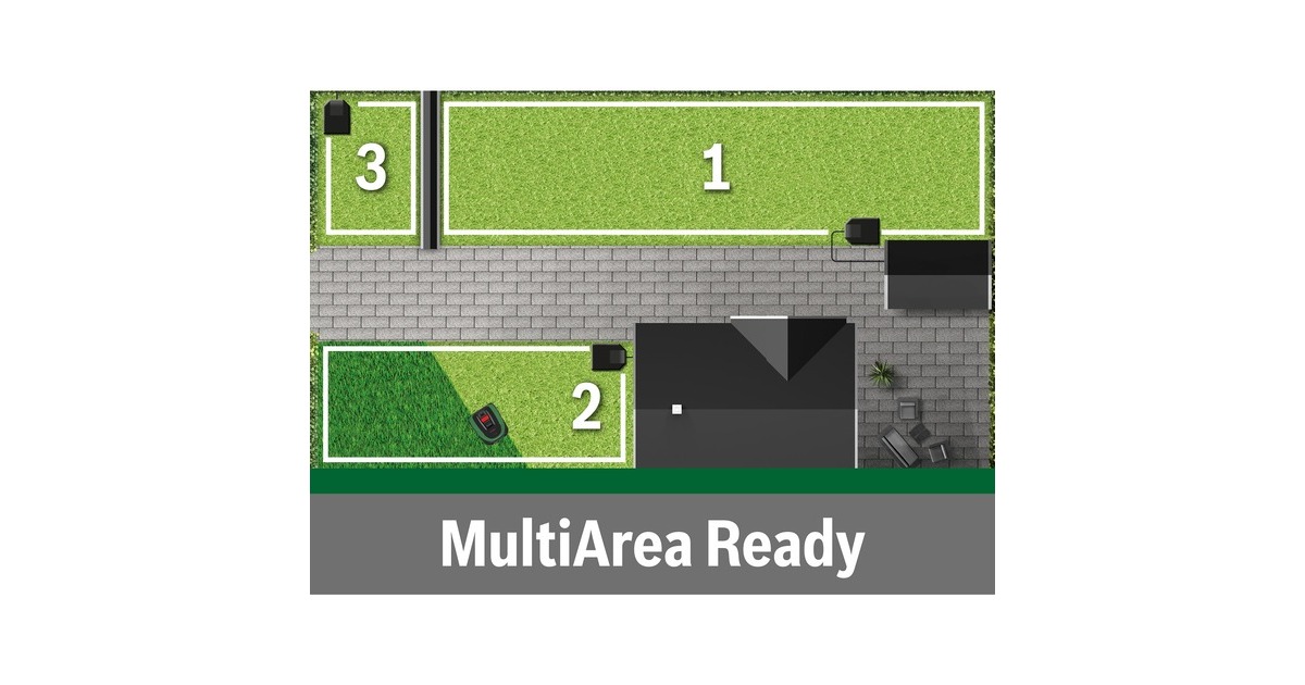 MultiArea speichert die Daten von bis zu drei Rasenflächen, BorderCut sorgt für einen sauberen Abschluss bis zur Kante, SpotMow ermöglicht präzises Mähen in engen Bereichen wie unter Gartenmöbeln |