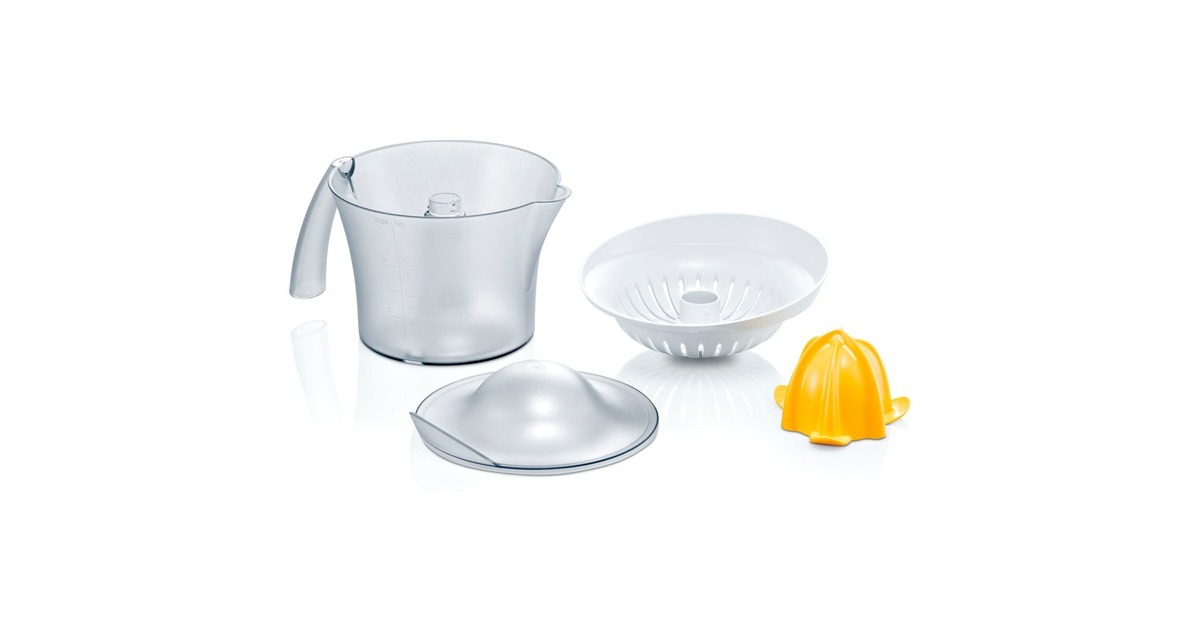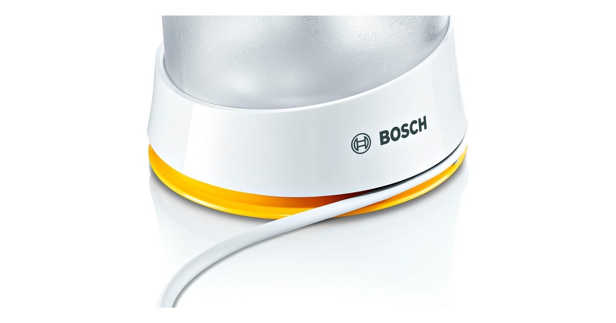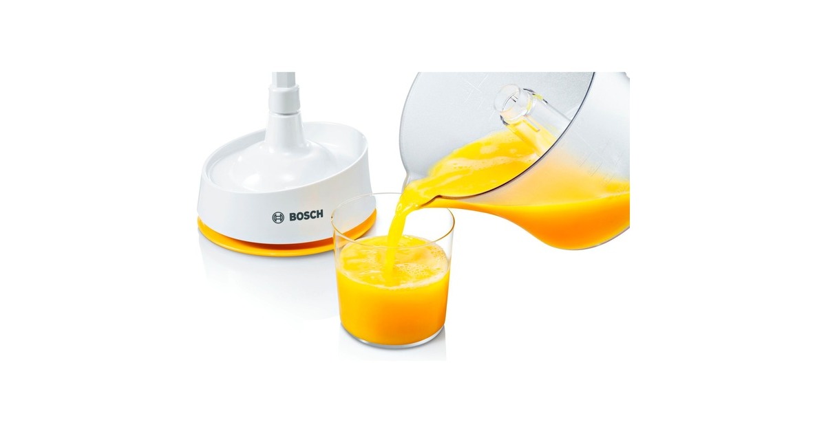 Die Bosch MCP3000N Zitruspresse verfügt über einen angenehm großen Universalpresskegel, mit dem sich sowohl große wie auch kleine Früchte verarbeiten lassen. Dank Links- und Rechtslauf erzielt man eine hohe Ausbeute und kann bis zu 800 ml im Saftbehälter aufnehmen, durch Eindrücken startet oder endet der Vorgang automatisch. Ein 25 W starker Motor sorgt dabei für optimale Ergebnisse.Art.-Nr.: 1497605