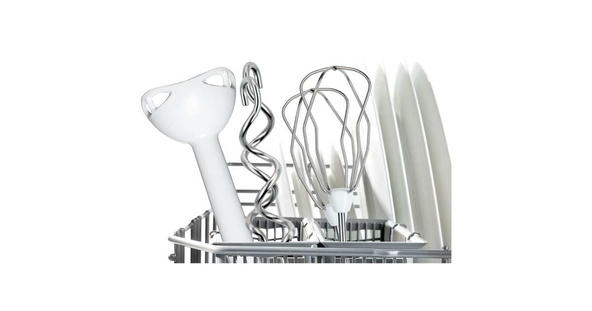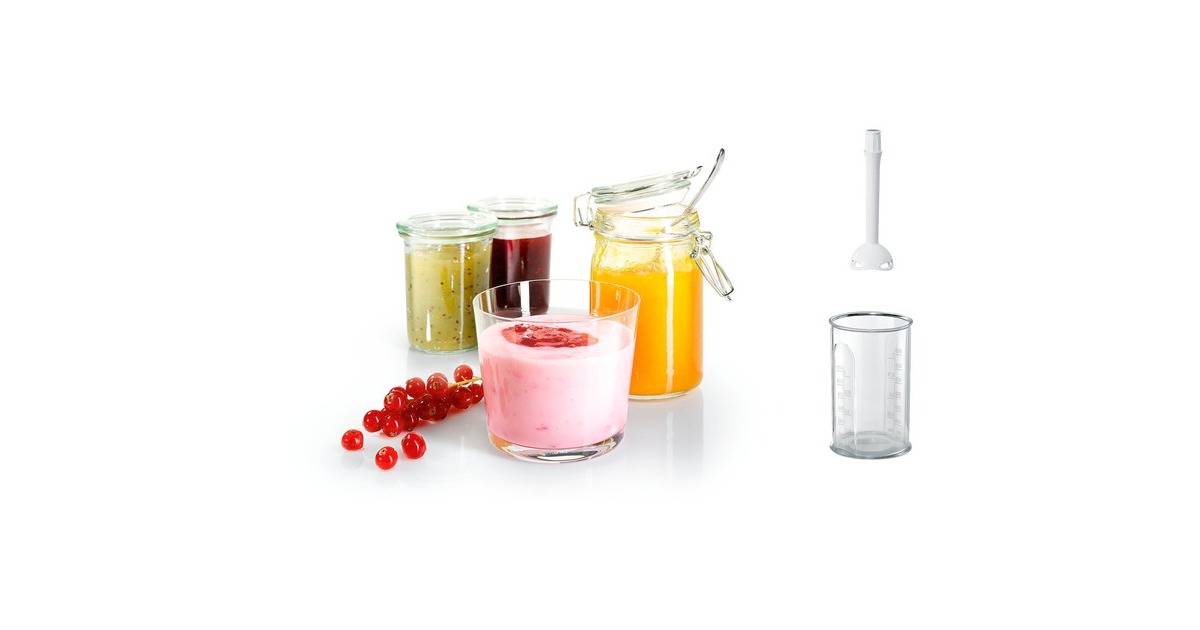 zwei Rühr-/Schlagbesen; zwei Knethaken aus Edelstahl; Kunststoff-Pürieraufsatz mit 4-Klingen-Edelstahlmesser; skalierter Mixbecher mit Deckel |