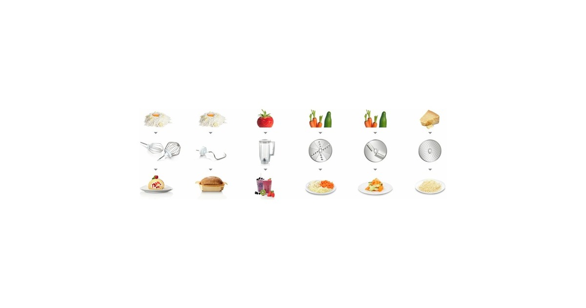 Knethaken mit Teigabweiser, Schlag- und Rührbesen, Durchlaufschnitzler inkl. 3 Edelstahlscheiben (Schneid-, Raspelwendescheibe, Reibscheibe mittelfein), Mixer-Aufsatz, Zubehörtasche für das Patisserie-Set, transparenter Deckel mit Einfüllöffnung |