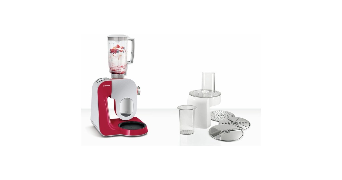 Knethaken mit Teigabweiser, Schlag- und Rührbesen, Durchlaufschnitzler inkl. 3 Edelstahlscheiben (Schneid-, Raspelwendescheibe, Reibscheibe mittelfein), Mixer-Aufsatz Kunststoff 1,25l, Zubehörtasche, interaktive Rezept DVD, transparenter Deckel mit Einfüllöffnung |