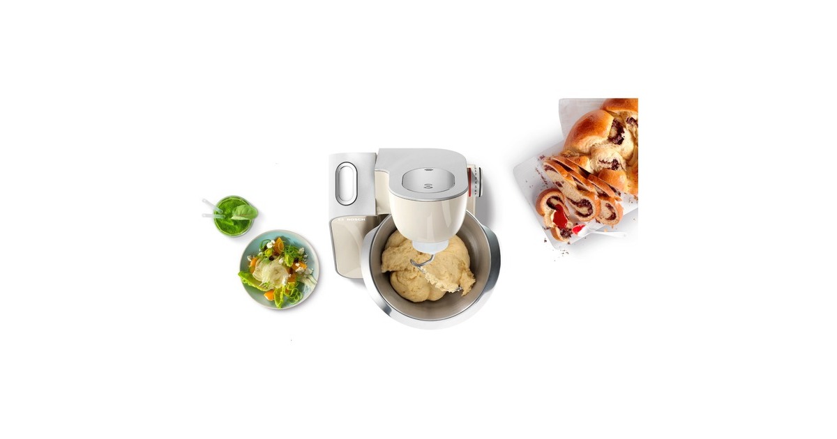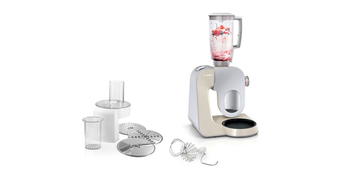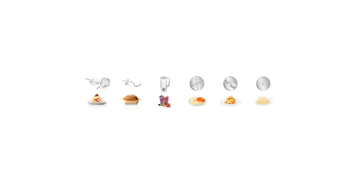 1x Knethaken mit Teigabweiser, Schlag- und Rührbesen, 1x Durchlaufschnitzler inkl. 3 Edelstahlscheiben (Schneid-, Raspelwendescheibe, Reibscheibe mittelfein), 1x Mixer-Aufsatz Kunststoff 1,25 l, 1 x Zubehörtasche dunkelgrau, 1x transparenter Deckel mit Einfüllöffnung, 1x interaktive Rezept DVD |