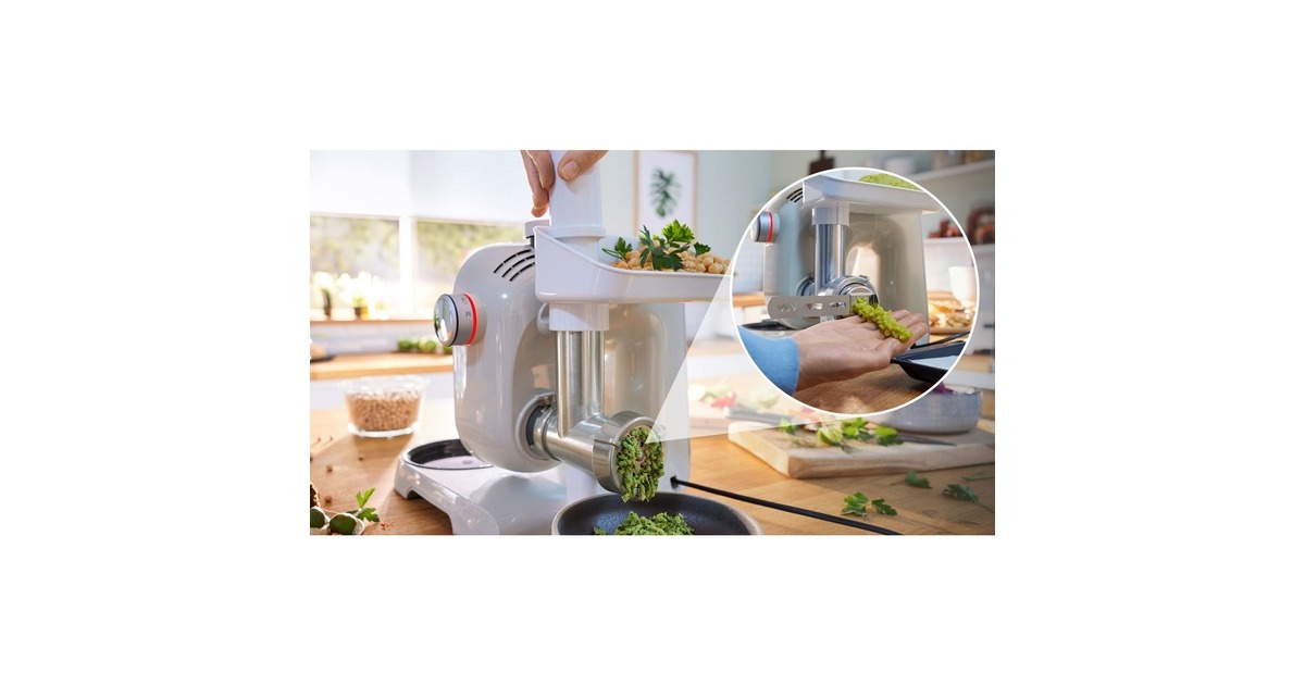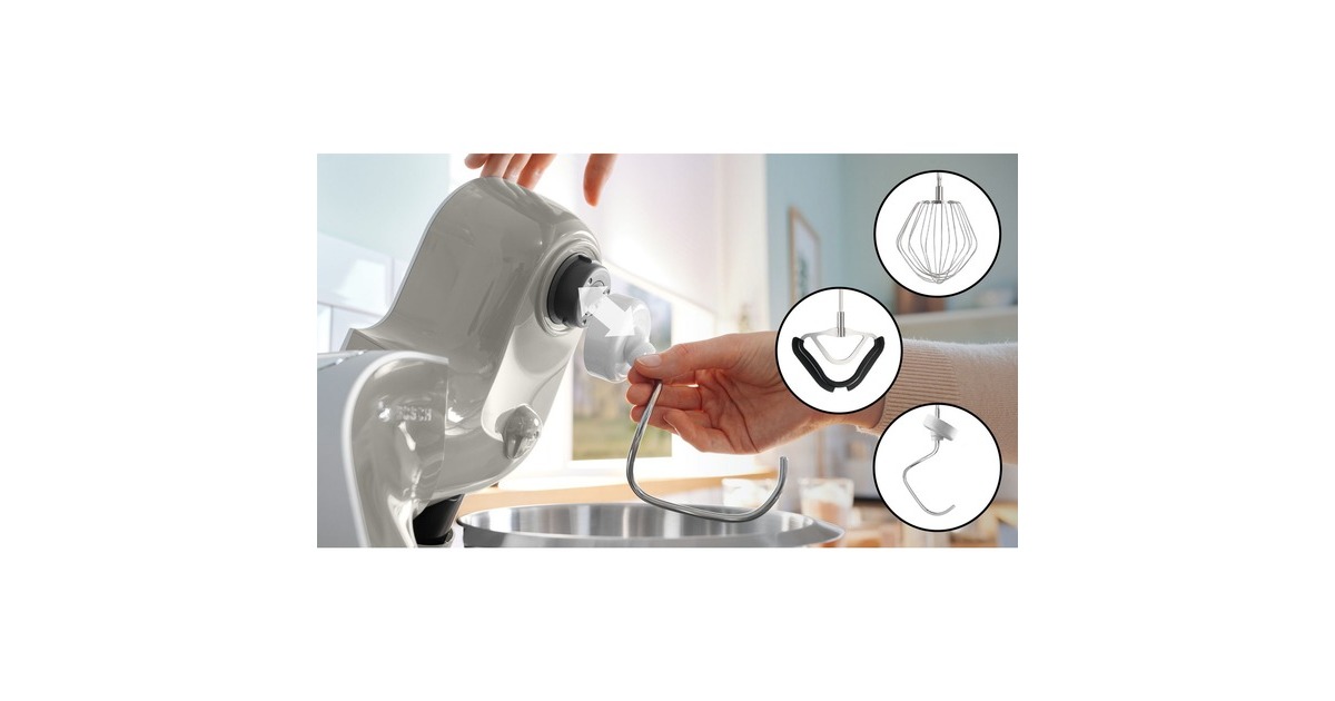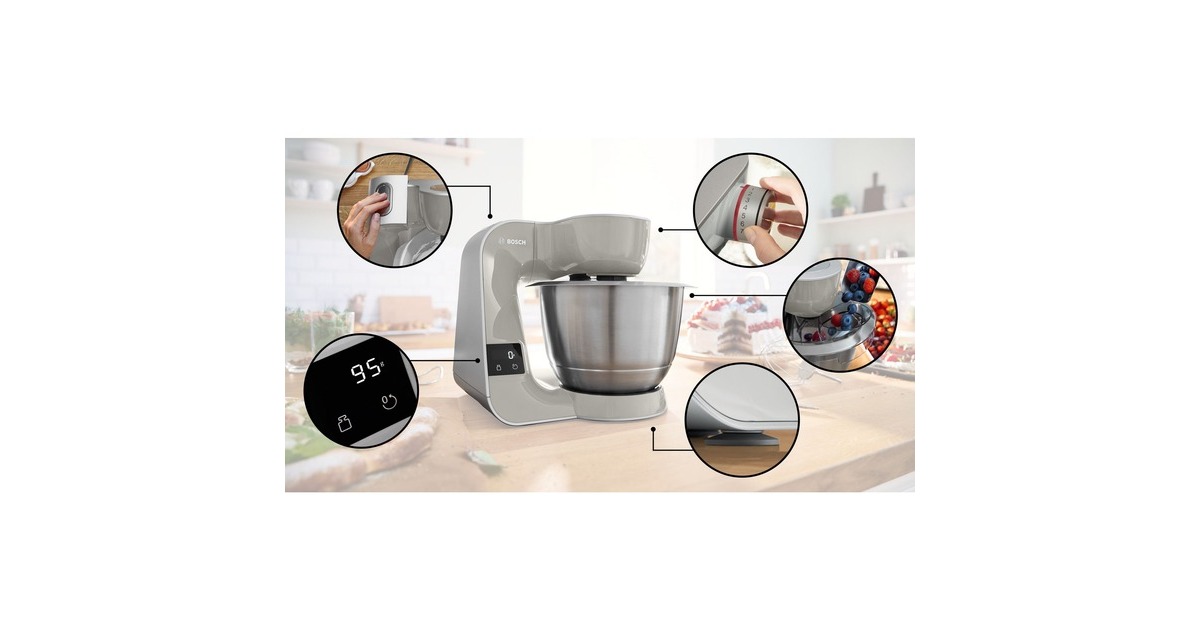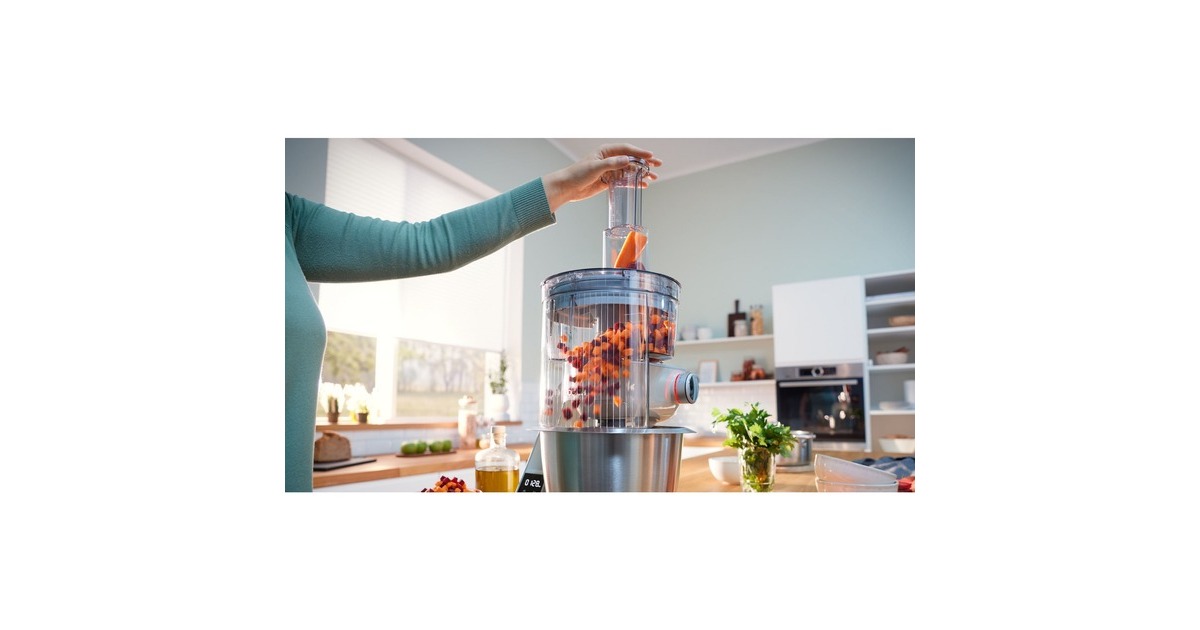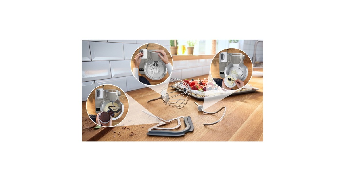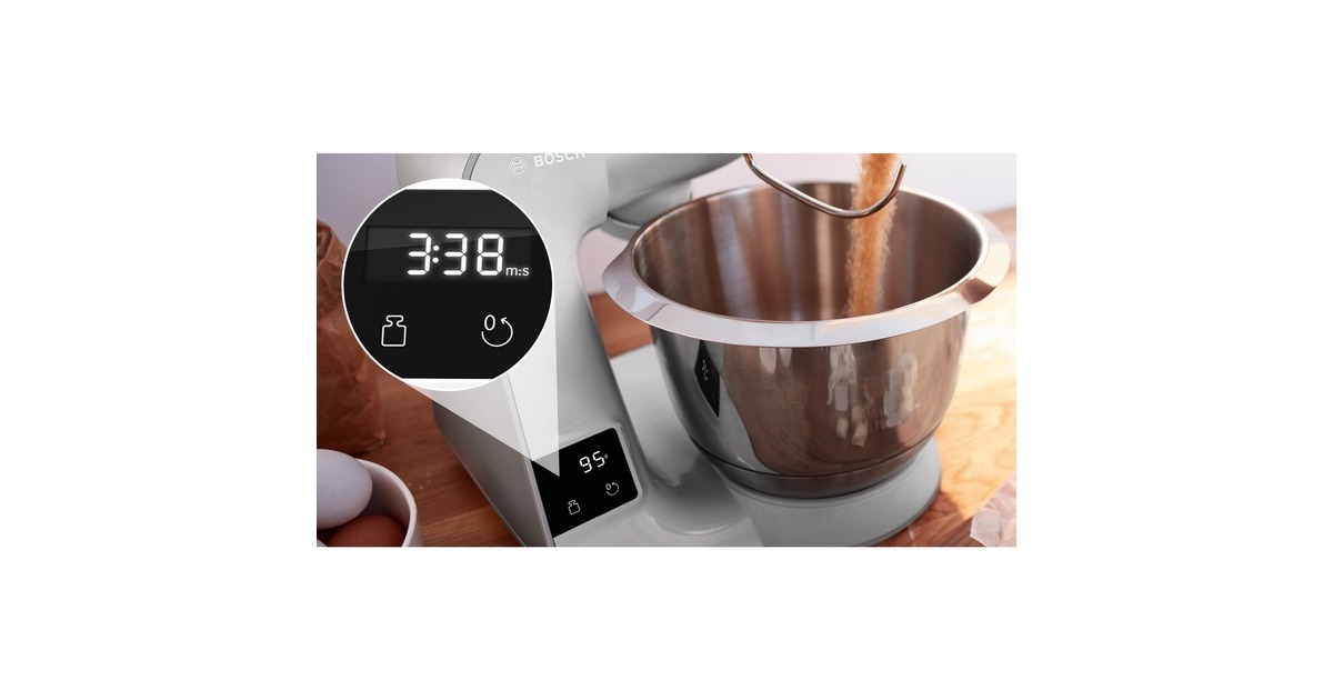 Mit Spitzenergebnissen und prämierten Design erfüllt die MUM5XL72 Küchenmaschine von Bosch auch Profiansprüche. Sie verarbeitet komfortabel und schnell auch von großen Mengen von bis zu 1 kg Mehl plus Zutaten - dank kraftvollem Motor mit 1.000 Watt. Teige werden in der großen Edelstahl-Rührschüssel (3,9 l Volumen) mit spezieller Innenform mit 3D PlanetaryMixing optimal vermengt. Dabei bewegen sich die Werkzeuge in 3 Richtungen, der Sockel entgegengesetzt dazu. Dadurch werden Zutaten von der Seite, dem Boden und der Mitte der Schüssel aufgenommen, was den Teig geschmeidig macht. Der Wechsel der Rührwerkzeuge ist dank EasyArmLift einfach und bequem. Auf Knopfdruck hebt sich der Rührarm von selbst. Bei der automatischen Parkposition bleiben die Teigwerkzeuge an der Rückwand der Schüssel stehen. Dadurch kann die Schüssel ganz einfach von vorne befüllt werden. Highlight dieser Küchenmaschine ist die integrierte Waage, die es ermöglicht Zutaten direkt in der Schüssel