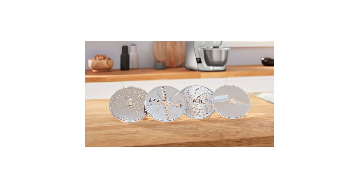 Deckel, Edelstahl-Rührschüssel, Fleischwolf, Knethaken, Kunststoff-Rührschüssel, Mixeraufsatz Kunststoff, Raspelwendescheibe grob/fein, Reibscheibe grob, Reibscheibe fein, Schneidwendescheibe dick/dünn, Spritzgebäckvorsatz, Würfelschneider, Würfeleinsatz 13 mm, Lochscheibe 5 mm, Premium Schlagbesen, Premium Rührbesen, dunkelgraue Zubehörtasche |