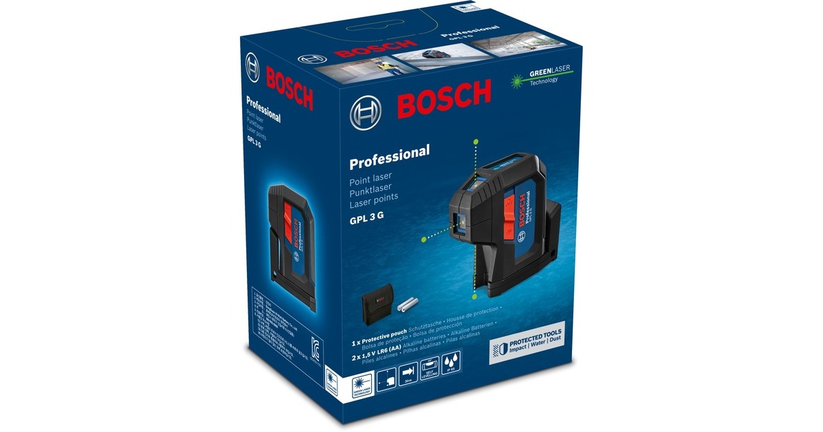 Der Bosch Punktlaser GPL 3 G Professional überzeugt mit seinem strapazierfähigen und kompakten Design. Seine grünen Laserpunkte bieten eine bis zu viermal bessere Sichtbarkeit als rote Punkte. Das gummi-ummantelte Gehäuse und das eingelassene Glas in Verbindung mit dem Staub- und Spritzwasserschutz nach IP 65 lassen den GPL 3 G Professional auch den rauesten Baustellenbedingungen trotzen. Der 3-Punkt-Laser ist dank der eingebauten Drehhalterung mit starken Magneten für schnelle und sichere Werkzeugbefestigung in kürzester Zeit transportbereit. Der GPL 3 G Professional eignet sich zur Übertragung von Referenzpunkten vom Boden zur Decke, z.B. bei der Installation von Innenraumbeleuchtung. Durch seine Formgebung eignet er sich auch perfekt für die Ausrichtung von Trockenwandunterkonstruktionen. Er verfügt außerdem über ein benutzerfreundliches Interface mit einem Zweipositionsschalter: Beim Einschalten nivelliert der Laser sich automatisch selbst, beim Ausschalten wird die Pendelarretierung aktiviert.Art.-Nr.: 1727861
