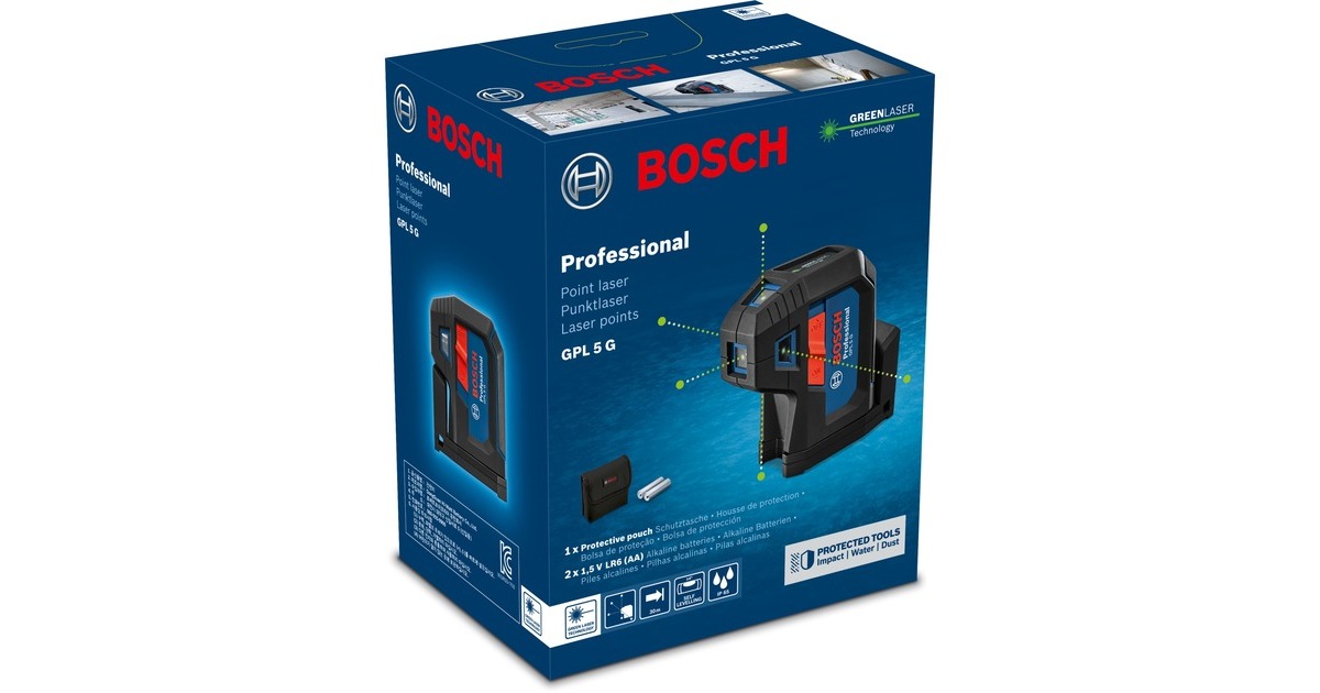 Der Bosch Punktlaser GPL 5 G Professional überzeugt mit seinem strapazierfähigen und kompakten Design. Seine grünen Laserpunkte bieten eine bis zu viermal bessere Sichtbarkeit als rote Punkte. Er ist die ideale Wahl für Übertragungen bei Wänden mit 90°-Winkel. Das gummi-ummantelte Gehäuse und das eingelassene Glas in Verbindung mit dem Staub- und Spritzwasserschutz nach IP 65 lassen den GPL 5 G Professional auch den rauesten Baustellenbedingungen trotzen. Der 5-Punkt-Laser ist dank der eingebauten Drehhalterung mit starken Magneten für schnelle und sichere Werkzeugbefestigung in kürzester Zeit transportbereit. Der GPL 5 G Professional eignet sich zur Raumaufteilung mit 90-Grad-Winkeln und zur Übertragung von Referenzpunkten vom Boden zur Decke, für Klempnerarbeiten und zur Errichtung von Trockenbauwandrahmen. Er verfügt außerdem über ein benutzerfreundliches Interface mit einem Zweipositionsschalter: Beim Einschalten nivelliert der Laser sich automatisch selbst, beim Ausschalten wird die Pendelarretierung aktiviert.Art.-Nr.: 1727860