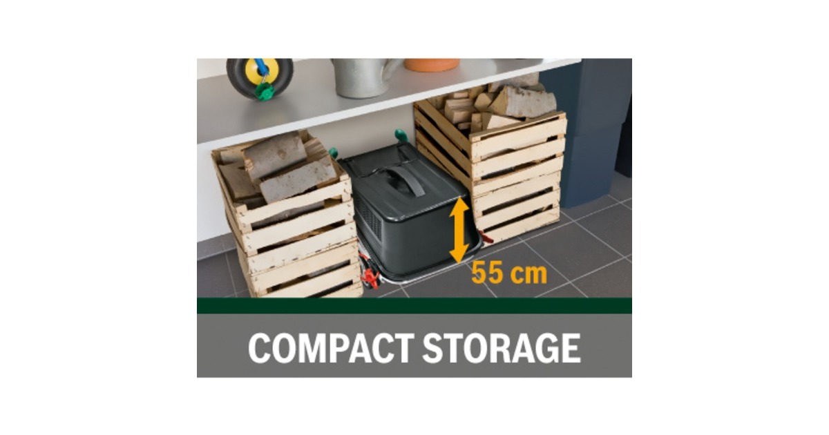 Integrierter Tragegriff; doppelt klappbarer Holm; stapelbare Grasfangbox |
