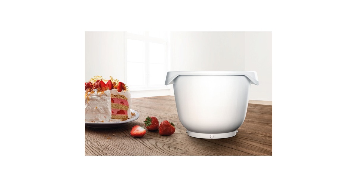 Extra große Schüssel von Bosch mit 5.5 l Fassungsvermögen für bis zu 3,5 kg Rührteig oder 1,5 kg Mehl plus Zutaten bei Hefeteig. Die Schüssel besteht aus Kunststoff. Sie ist robust, langlebig, lebensmittelecht und geschmacksneutral. Auch einfach zu reinigen, da sie spülmaschinengeeignet ist. Einfache und komfortable Handhabung dank praktischer Griffe. Art.-Nr.: 1359909