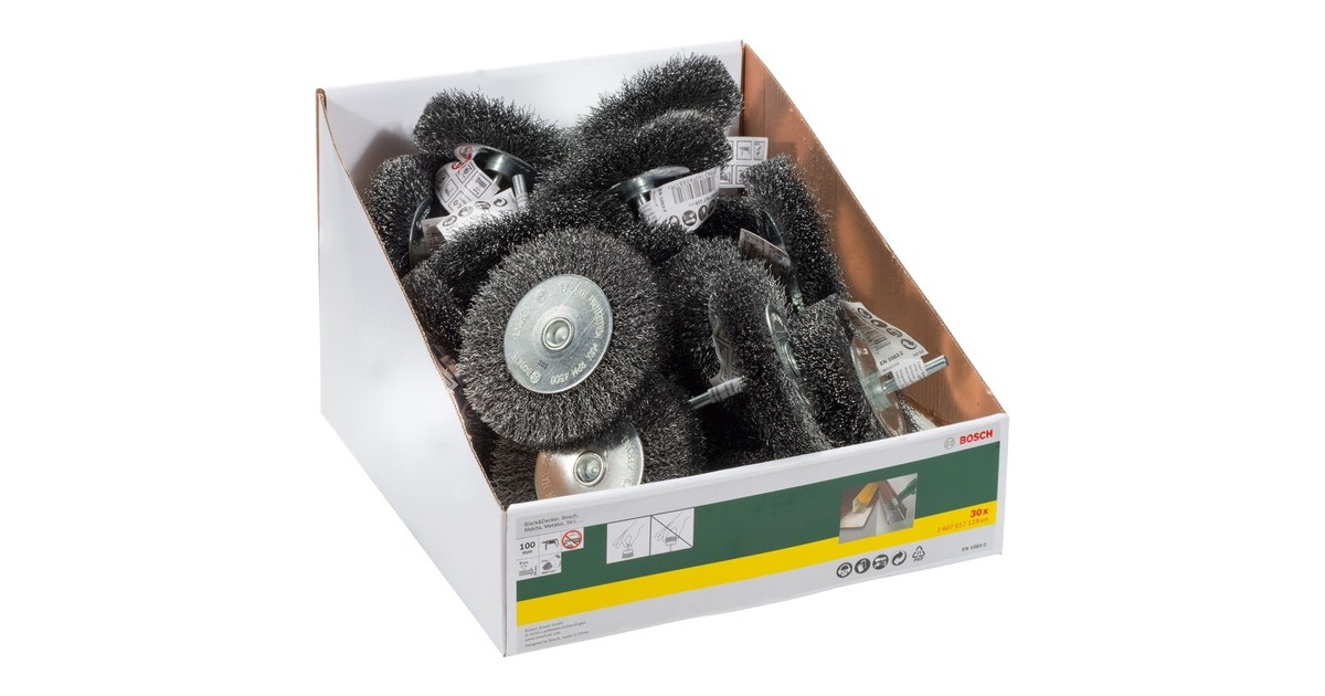 Drahtbüsten werden in verschiedenen Stärken für verschiedene Schleifgrade angeboten. Stärkerer Draht arbeitet intensiver und schafft schnell Oberflächen, die allerdings grob sind. Dünnerer Draht sorgt für feinere und glattere Oberflächen. |
