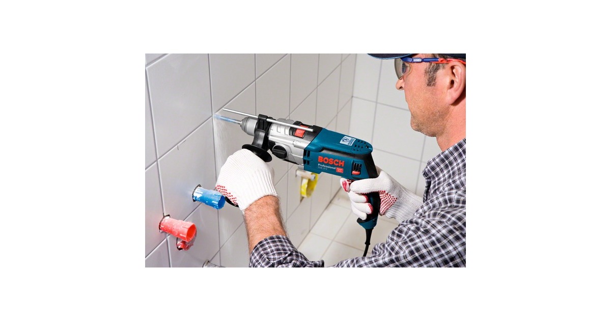 Die kabelgebundene Bosch Schlagbohrmaschine GSB 20-2 Professional ist eine vielseitige 2-Gang-Schlagbohrmaschine mit Überlastkupplung und Drehzahlvorwahl. Das Schnellspannbohrfutter mit Auto-Lock ermöglicht einen einfachen und schnellen Werkzeugwechsel. Die Schlagbohrmaschine GSB 20-2 Professional ist mit einem 850 Watt starken Motor und einem 2-Gang-Planetengetriebe ausgestattet. Über den großen Schalter und das Stellrad lässt sich die Drehzahl ganz einfach zwischen 0 und maximal regulieren, was ein dosiertes Arbeiten ermöglicht, beispielsweise beim Anbohren glatter Flächen oder beim Eindrehen von Schrauben. Die Funktion Kickback Control sorgt dafür, dass die Bohrmaschine bei plötzlichem Blockieren sofort abgeschaltet wird. Mit dem Rechts-/Linkslauf lassen sich auch Schraubarbeiten erledigen.Art.-Nr.: 1618069