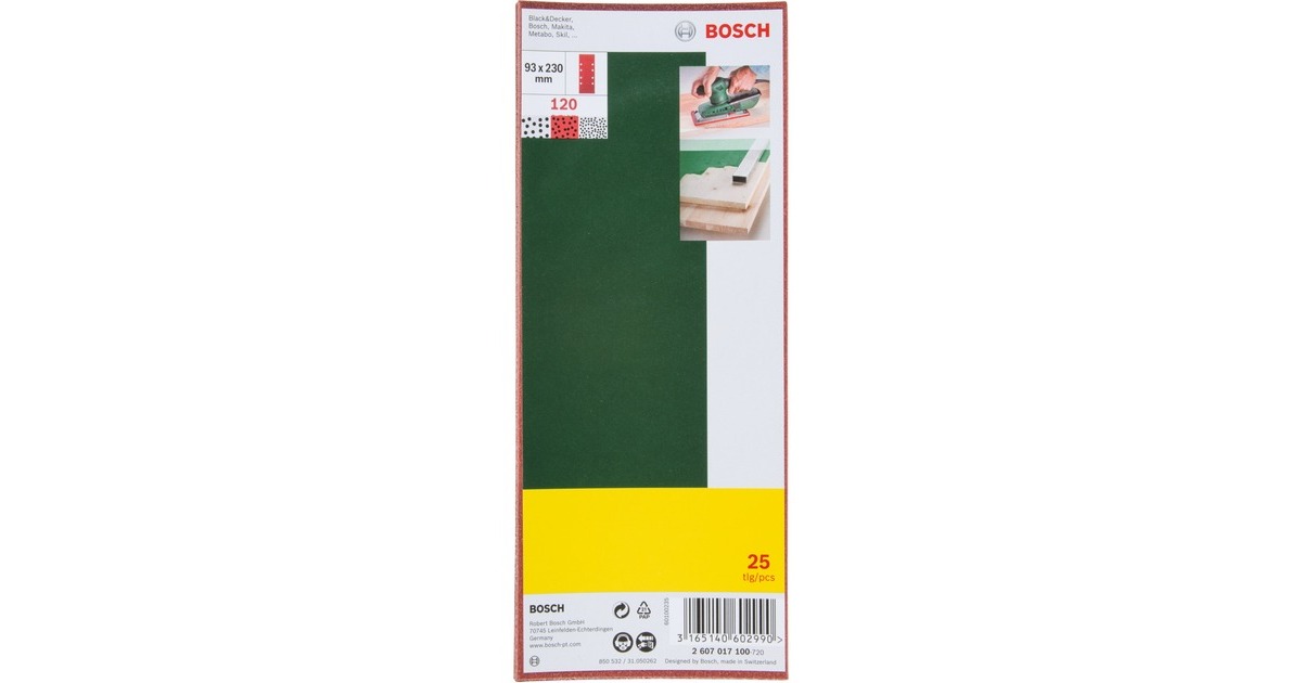Das 25-teilige Bosch Schleifblatt-Set 2607017100 eignet sich für Schwingschleifer mit Spannbügelbefestigung aller Elektrowerkzeugmarken. Die leistungsstarken, langlebigen Schleifblätter sorgen für gleichmäßiges Schleifen auf größeren, ebenen Flächen. Die 120er Körnung (fein) ist ideal für gleichmäßiges Schleifen von Holz, Metall, Farbe, Lack und Füller. Die Universal-Schleifblätter verfügen über acht Absauglöcher für eine Staubabsaugung.Art.-Nr.: 1023467