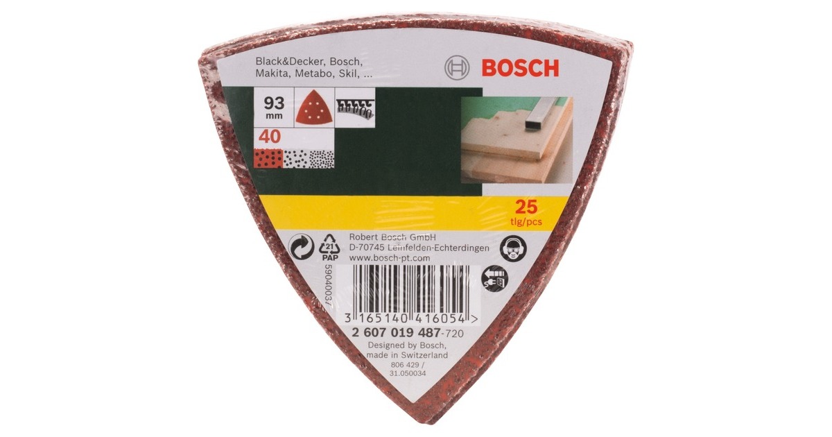 Das 25-teilige Bosch Schleifblatt-Set Delta 40 eignet sich für Dreieckschleifer aller Elektrowerkzeugmarken. Die leistungsstarken Schleifblätter sorgen für detailgenaues Schleifen auf kleinen Flächen, in Ecken, Profilen und auf Kanten. Die 40er Körnung (sehr grob) ist ideal für den Grobschliff, zum Abtragen von Holz, Metall, Rost, Farbe, Lack und Füller. Die Universal-Schleifblätter verfügen über ein Klettverschlusssystem für sicheren Halt und schnellen Blattwechsel, sowie über sechs Absauglöcher für eine Staubabsaugung.Art.-Nr.: 1023230