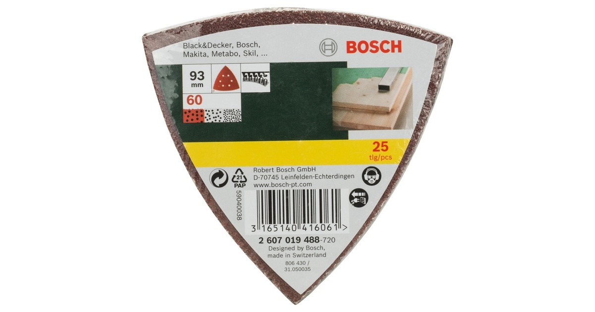 Das 25-teilige Bosch Schleifblatt-Set Delta 60 eignet sich für Dreieckschleifer aller Elektrowerkzeugmarken. Die leistungsstarken Schleifblätter sorgen für detailgenaues Schleifen auf kleinen Flächen, in Ecken, Profilen und auf Kanten. Die 60er Körnung (grob) ist ideal für den Vorschliff, zum Abtragen von Holz, Metall, Rost, Farbe, Lack und Füller. Die Universal-Schleifblätter verfügen über ein Klettverschlusssystem für sicheren Halt und schnellen Blattwechsel, sowie über sechs Absauglöcher für eine Staubabsaugung.Art.-Nr.: 1023231