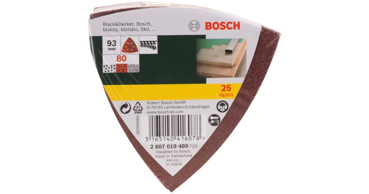 Das 25-teilige Bosch Schleifblatt-Set Delta 80 eignet sich für Dreieckschleifer aller Elektrowerkzeugmarken. Die leistungsstarken Schleifblätter sorgen für detailgenaues Schleifen auf kleinen Flächen, in Ecken, Profilen und auf Kanten. Die 80er Körnung (mittelfein) ist ideal für das Vorbereiten von Oberflächen wie Holz, Metall, Farbe, Lack und Füller. Die Universal-Schleifblätter verfügen über ein Klettverschlusssystem für sicheren Halt und schnellen Blattwechsel, sowie über sechs Absauglöcher für eine Staubabsaugung.Art.-Nr.: 1023232