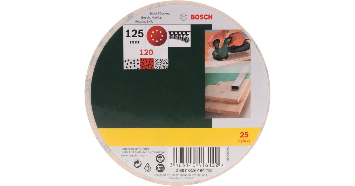 Das 25-teilige Bosch Schleifblatt-Set Exzenter eignet sich für Exzenterschleifer aller Elektrowerkzeugmarken. Die leistungsstarken Schleifblätter sorgen für detailgenaues Schleifen auf ebenen und leicht gewölbten Flächen. Die 120er Körnung (fein) ist ideal für das Vorbereiten von Oberflächen wie Holz, Metall, Farbe, Lack und Füller, oder zum Feinschliff. Die Universal-Schleifblätter verfügen über ein Klettverschlusssystem für sicheren Halt und schnellen Blattwechsel, sowie über acht Absauglöcher für eine Staubabsaugung.Art.-Nr.: 1023262