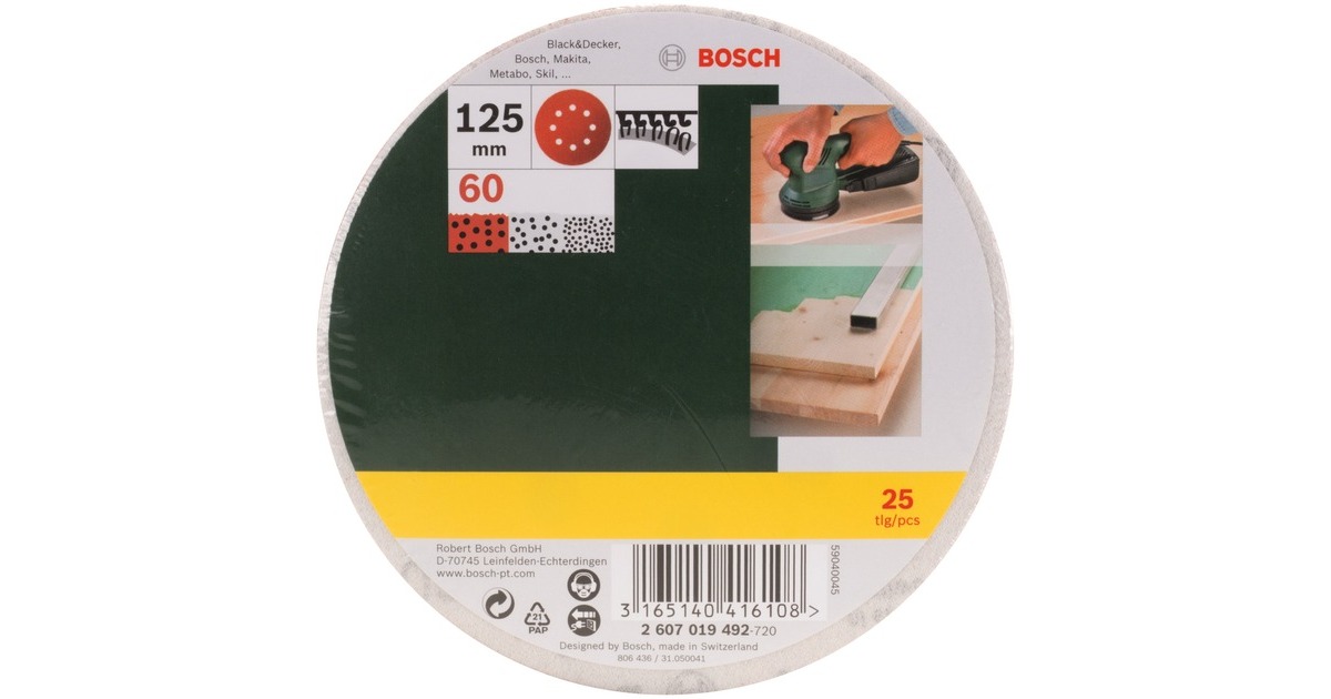 Das 25-teilige Bosch Schleifblatt-Set Exzenter eignet sich für Exzenterschleifer aller Elektrowerkzeugmarken. Die leistungsstarken Schleifblätter sorgen für detailgenaues Schleifen auf ebenen und leicht gewölbten Flächen. Die 60er Körnung (mittel) ist ideal für den Vorschliff, zum Abtragen von Holz, Metall, Rost, Farbe, Lack und Füller. Die Universal-Schleifblätter verfügen über ein Klettverschlusssystem für sicheren Halt und schnellen Blattwechsel, sowie über acht Absauglöcher für eine Staubabsaugung.Art.-Nr.: 1023260