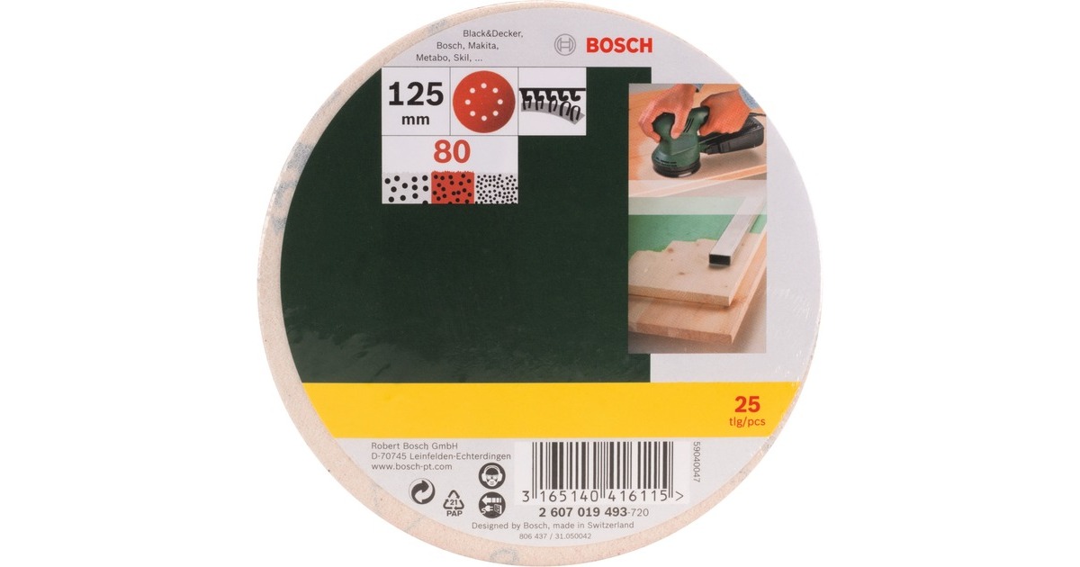 Das 25-teilige Bosch Schleifblatt-Set Exzenter eignet sich für Exzenterschleifer aller Elektrowerkzeugmarken. Die leistungsstarken Schleifblätter sorgen für detailgenaues Schleifen auf ebenen und leicht gewölbten Flächen. Die 80er Körnung (mittelfein) ist ideal für das Vorbereiten von Oberflächen wie Holz, Metall, Farbe, Lack und Füller. Die Universal-Schleifblätter verfügen über ein Klettverschlusssystem für sicheren Halt und schnellen Blattwechsel, sowie über acht Absauglöcher für eine Staubabsaugung.Art.-Nr.: 1023261