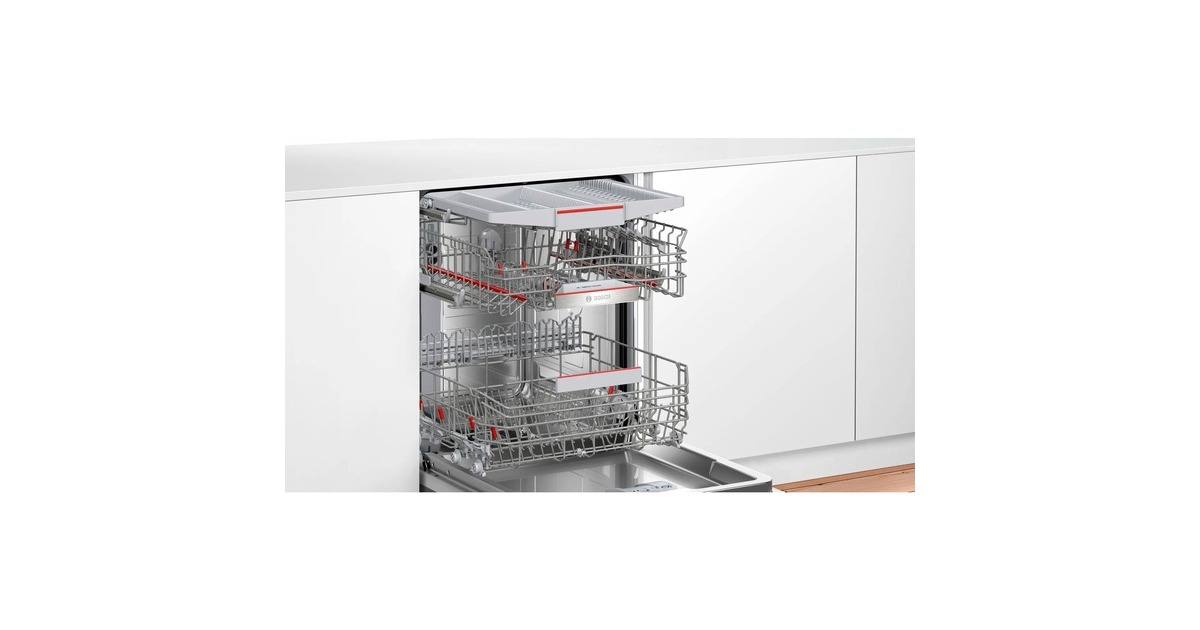 Der integrierbare Geschirrspüler Bosch SMD6ECX00E nimmt bis zu 14 Maßgedecke auf und sorgt für beste Trocknungsergebnisse. Zur Verfügung stehen acht verschiedene Spülprogramme sowie verschiedene Zusatzfunktionen. Die Automatikprogramme sorgen automatisch für beste Spülergebnisse und mit dem Favoritenprogramm können individualisierte Einstellungen mit nur einem Knopfdruck gestartet werden. Die Flex Körbe und die VarioSchublade lassen sich praktisch und komfortabel Beladen. Die Glasschutz-Technik sorgt für die schonende Behandlung von Gläsern und empfindlichem Geschirr und die zuwählbare. Das AquaStop-System schützt vor Wasserschäden. Mit einer Lautstärke von 42 Dezibel ist der SMD6ECX00E zudem angenehm leise, noch leiser läuft er im Silence-Programm. Dank der Home Connect-App ist der Geschirrspüler SMD6ECX00E über Handy oder Tablet steuerbar.Art.-Nr.: 100021068