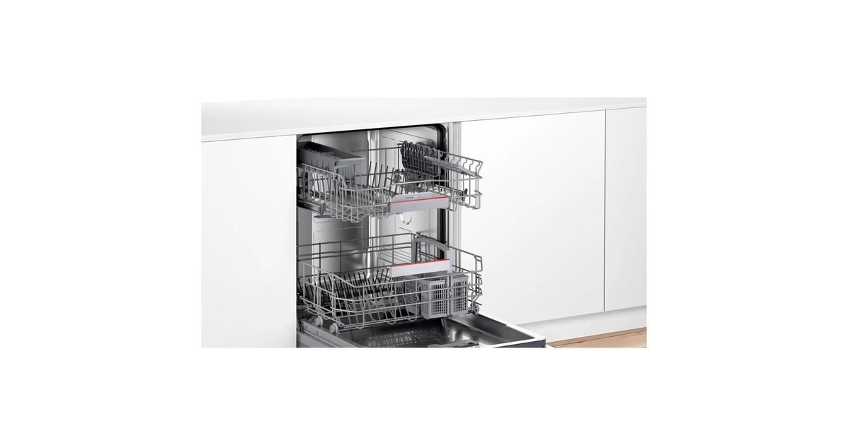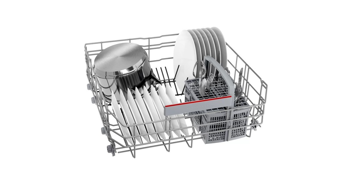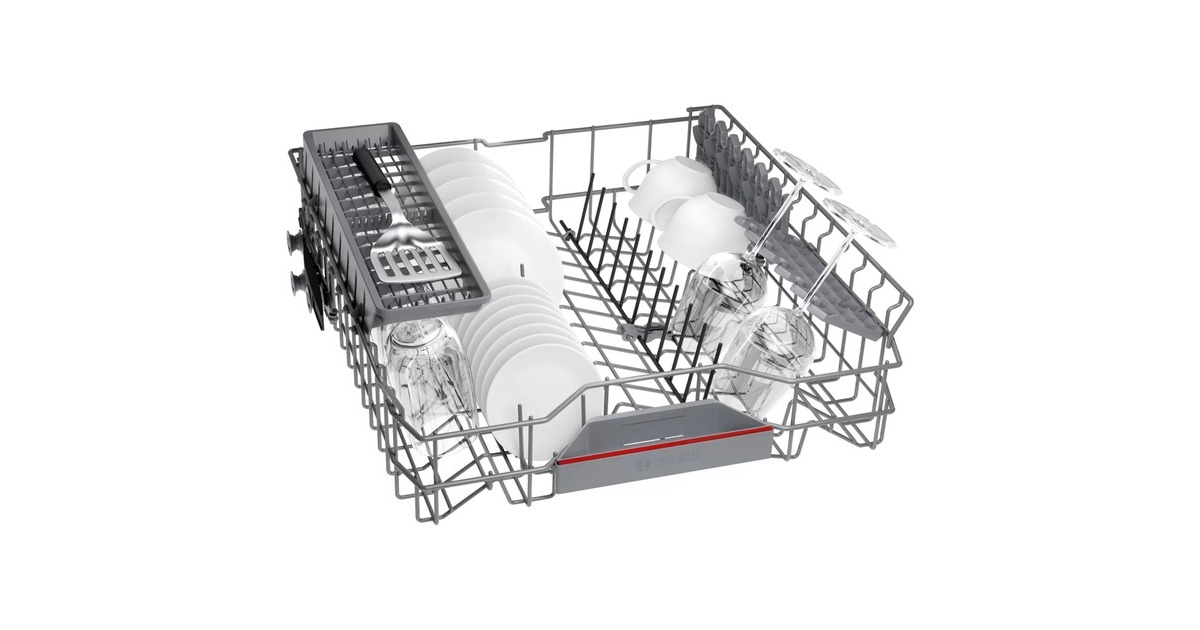 höhenverstellbarer Oberkorb mit Rackmatic (3-stufig), 2x umklappbare Stachelreihen, 2 Tassenablagen mit weicher Silikon Beschichtung, Besteckablage |