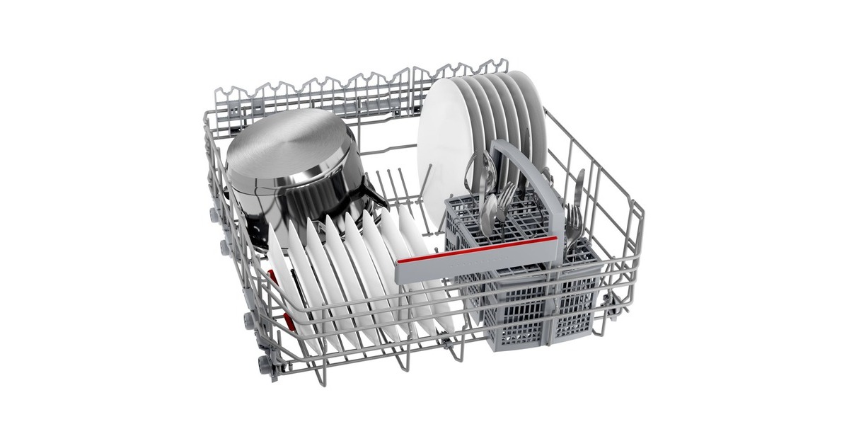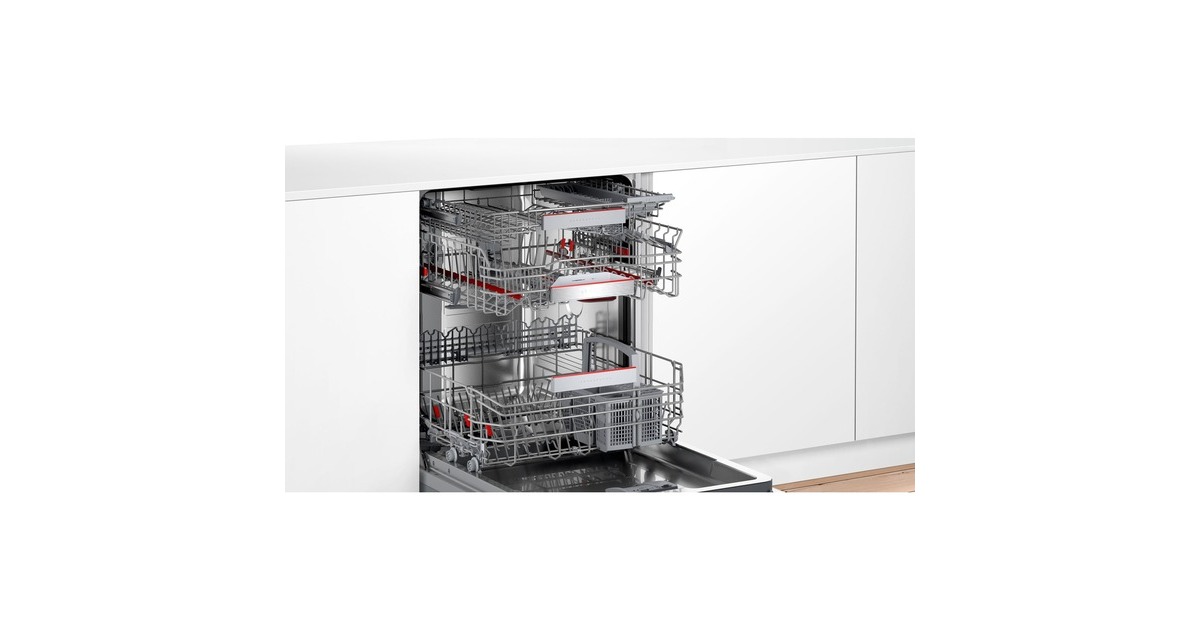 Max Flex Korbsystem mit farbigen Touchpoints, Extra Clean Zone, Dritter Korb, Komfortrollen im Unterkorb und der 3. Beladungsebene, farbige Anti-Rutsch-Beschichtung im Oberkorb, Korbstopper (Rack Stopper) gegen ein Überrollen des Unterkorbes, bewegliche Messeretagere |