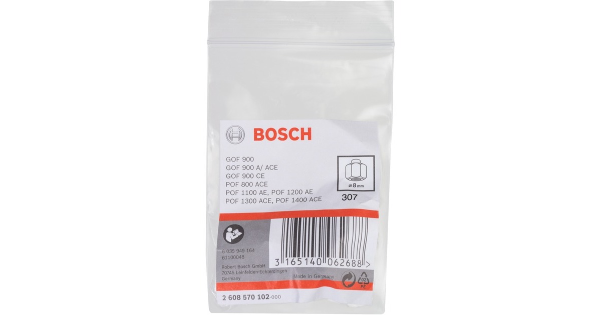 Die Spannzange 2608570102 von Bosch hält Fräser in der Aufnahme fest. Es muss immer eine Spannzange in der richtigen Größe verwendet werden, um Gefahren während des Betriebs zu vermeiden. Für Fräser eignen sich keine Schafthülsen. Die Spannzange Ø 8mm eignet sich für die Oberfräsen GOF 130, GOF 900, GOF 900 A, GOF 900 ACE, GOF 900 CE, GOF 1250 LCE Professional, POF 800 ACE, POF 1100 AE, POF 1200 AE, POF 1300 ACE, POF 1400 ACE.Art.-Nr.: 1687751