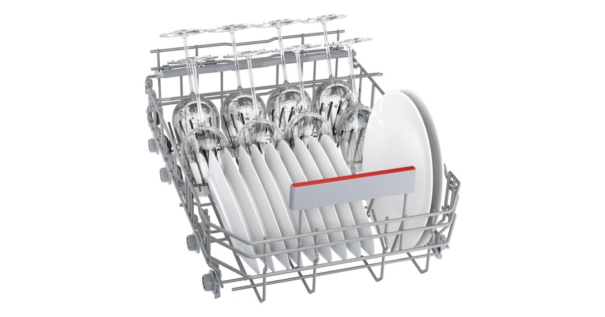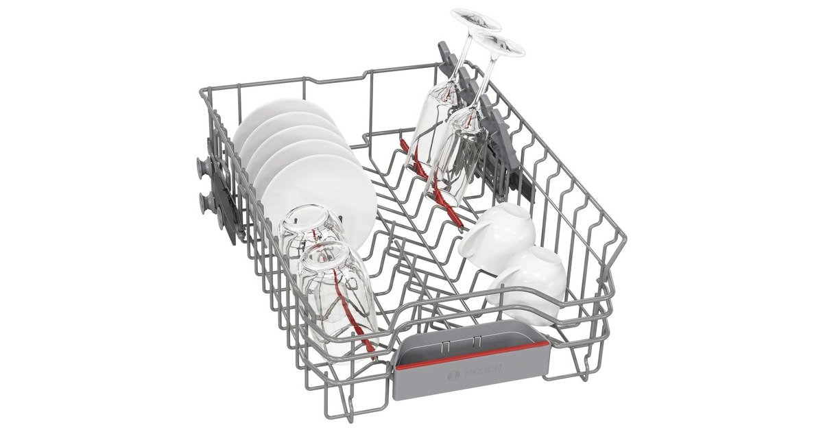 Komfortrollen, Korbstopper, 2x Umklappbare Stachelreihen, Tassenablage (2-teilig), Gläseranlagebügel |