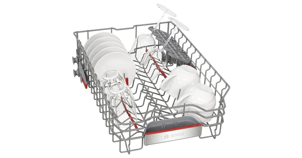 Komfortrollen, Korbstopper, 4x Umklappbare Stachelreihen, Tassenablage (2-teilig), Gläseranlagebügel |