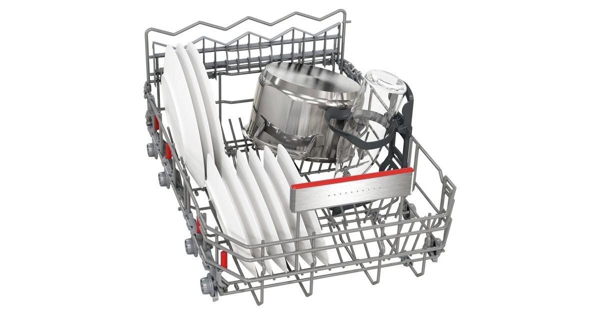 Komfortrollen, Korbstopper, 4x Umklappbare Stachelreihen, Tassenablage (2-teilig), Gläseranlagebügel |