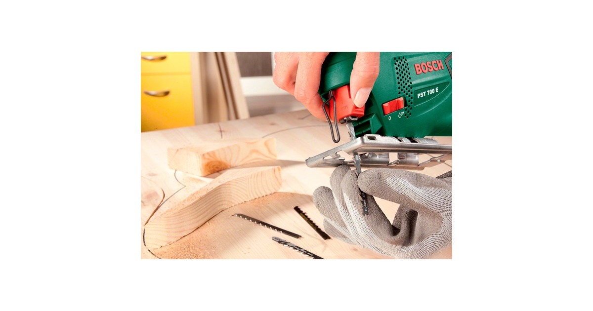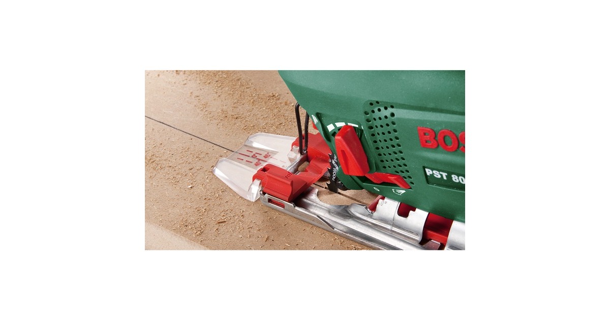 Die Bosch Stichsäge PST 700 E überzeugt mit kompakter Größe, geringem Gewicht, hervorragender Handlichkeit und optimalem Benutzerkomfort. Dank der elektronischen Hubzahlsteuerung über den Druckschalter gelingt der Sägestart einfach, und materialgerechtes Arbeiten ist kein Problem. Die PST 700 E minimiert mit dem Bosch-"Low Vibration" mit linearen Massenausgleich die Vibrationen und gewährleistet sicheres und komfortables Arbeiten. Mit der PST 700 E lassen sich enge Kurven und geschwungene Linien sägen, aber auch Geraden- und Gehrungsschnitte. Durch den Softgrip und die erhebliche Verminderung von Vibrationen liegt sie griffsicher in der Hand und lässt sich auch von weniger erfahrenen Heimwerkern gut handhaben. Dabei gewährt die zuschaltbare Späneblasfunktion jederzeit klare Sicht auf die Schnittlinie, so dass die Schnitte sehr einfach kontrolliert werden können. Die stabile Fußplatte aus Stahl ermöglicht dabei eine sichere Führung des Sägeblatts. Für Gehrungsschnitte bis zu 45° kann sie einfach verstellt werden. Das Bosch-SDS sorgt für einen mühelosen und sicheren Sägeblattwechsel in Sekundenschnelle, ohne zusätzliches Werkzeug. Die PST 700 E eignet sich für Schnitte bis zu 70mm im 45°- bis 90°-Winkel in verschiedenen Materialien wie Holz, Laminat, Aluminium oder Kunststoff.Art.-Nr.: 1620786