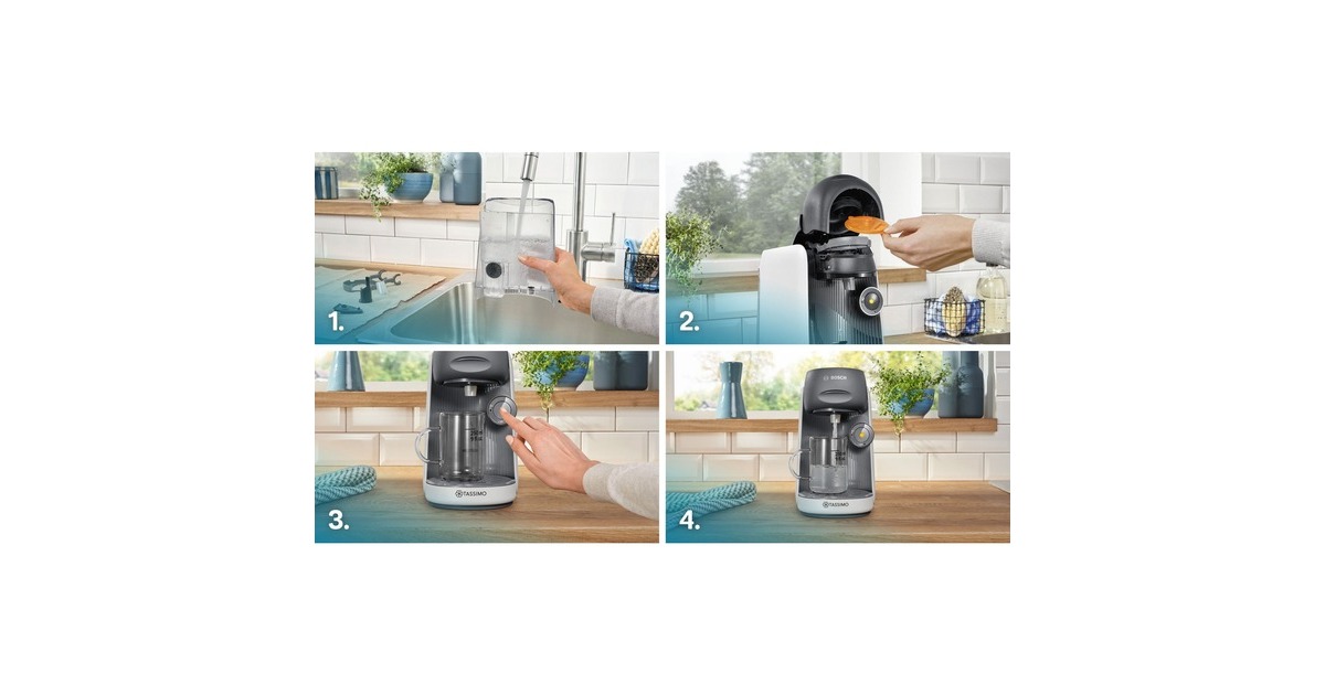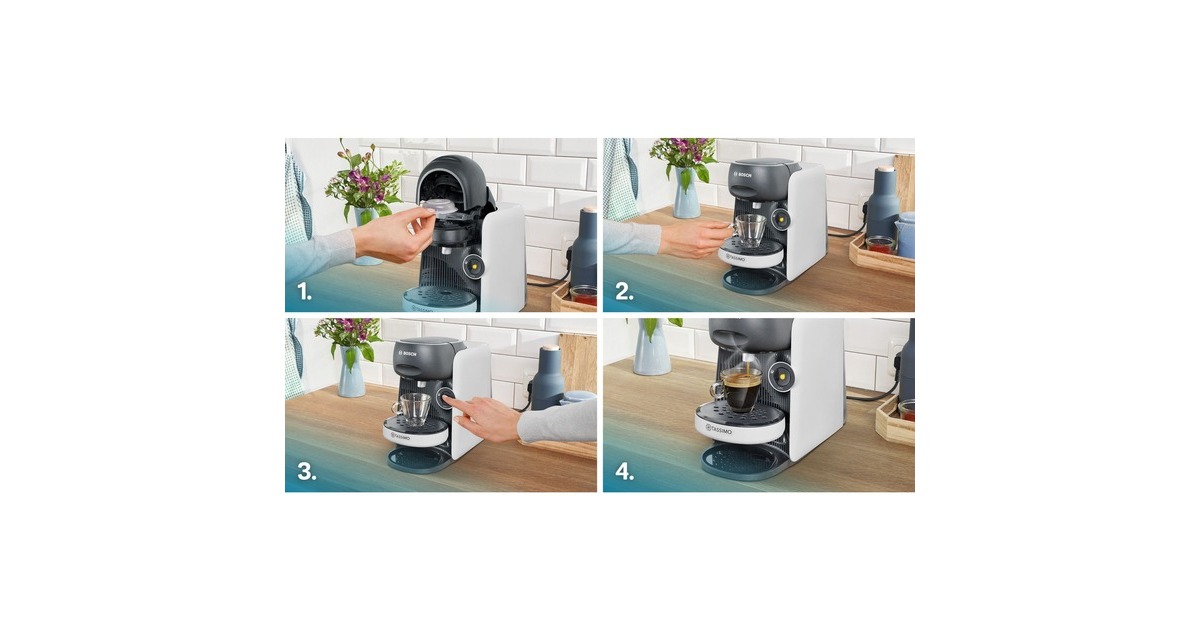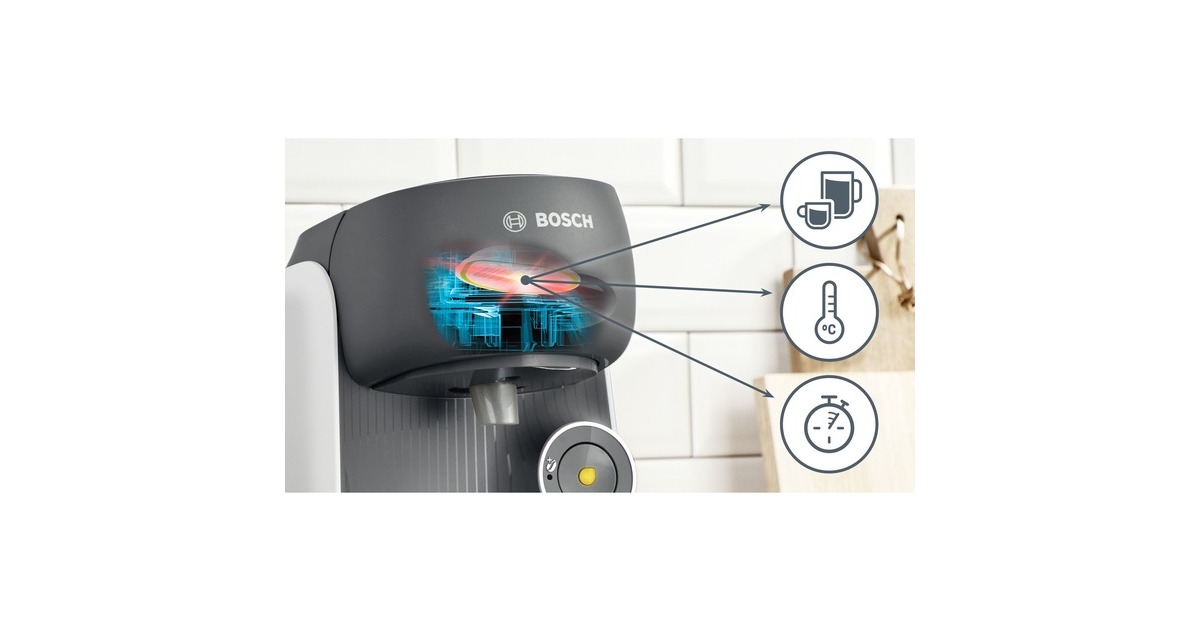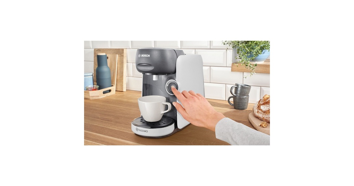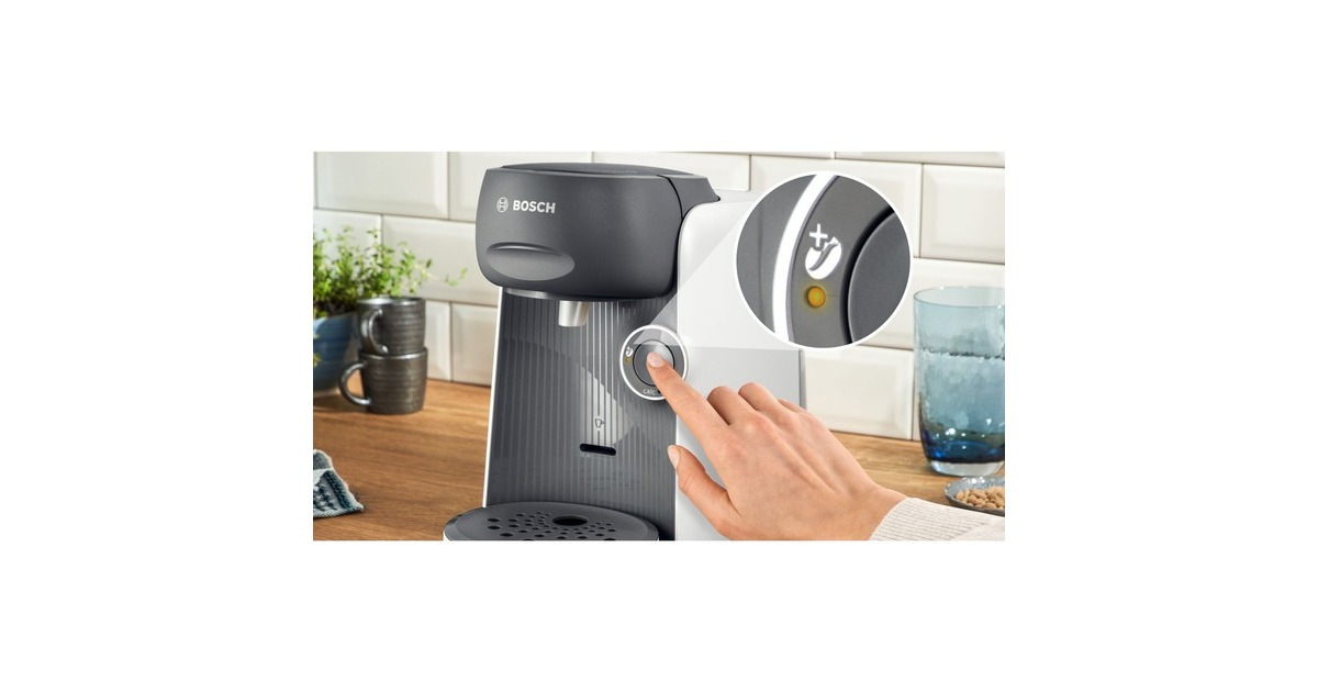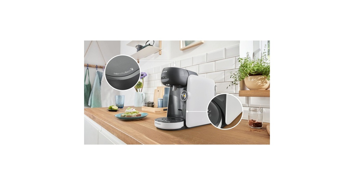 Das Bosch Multigetränkesystem Tassimo Finesse TAS16B4 besticht durch seine bunte Farbgebung. Über die vollautomatische Ein-Knopf-Bedienung lässt sich die Tassimo Happy bietet eine große Getränkevielfalt mit über 70 Spezialitäten wie Espresso, Caffè Crema, Filterkaffee, Latte Macchiato, Cappuccino, heiße Kakao-Spezialitäten und Tee. Perfekte Getränkequalität dank INTELLIBREW: Dank der patentierten Barcode-Technologie wird jedes Getränk mit der richtigen Wassermenge, Temperatur und Brühzeit perfekt zubereitet. Das TASSIMO-Gerät liest den jeweiligen Barcode und brüht so das perfekte Getränk. Die IntensityBoost Funktion bietet die Möglichkeit beim längeren Drücken auf den Knopf einen Kaffee mit intensiverem Aroma zu erhalten. Der automatische Dampfstoß zur Reinigung nach jeder Getränkezubereitung verhindert die Geschmacksübertragung zwischen den verschiedenen Getränken.Art.-Nr.: 1877003