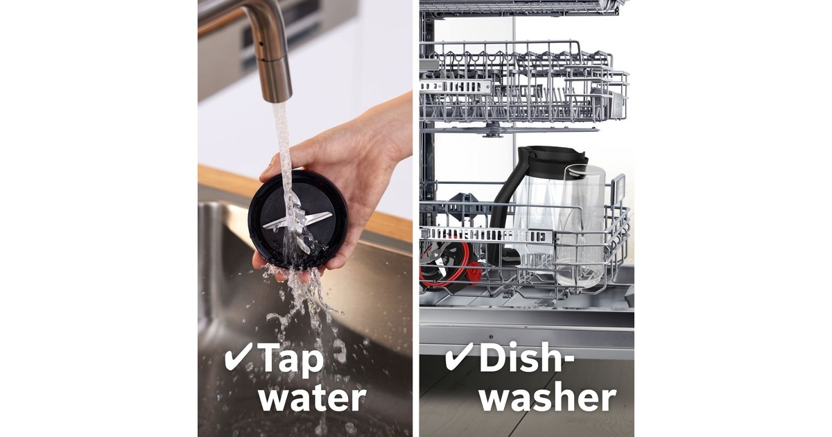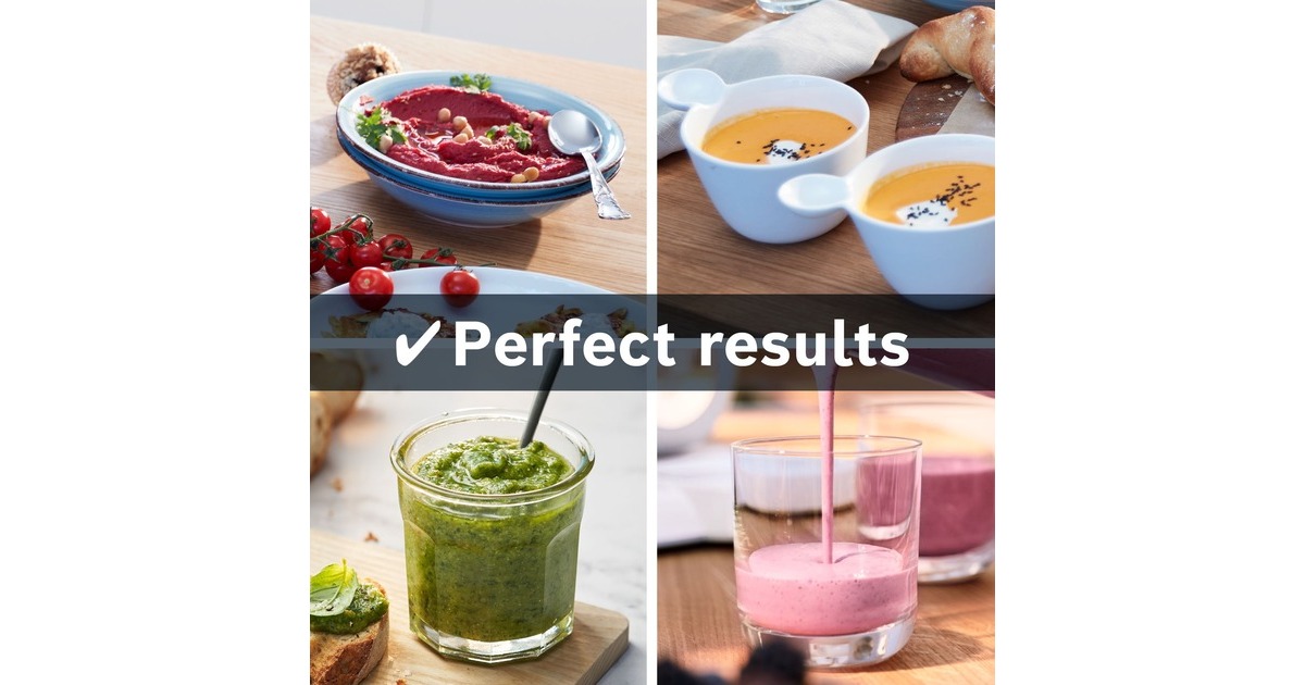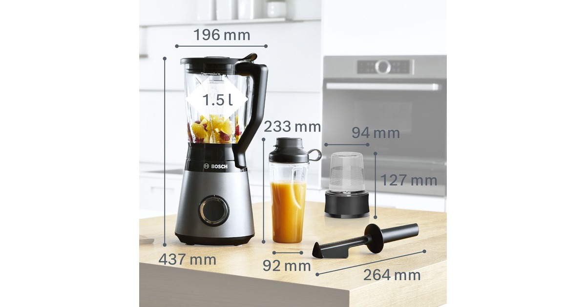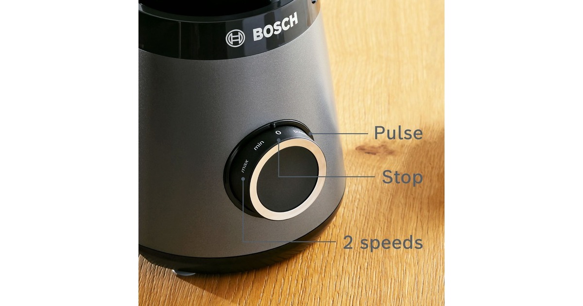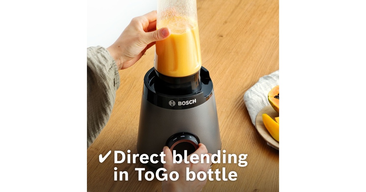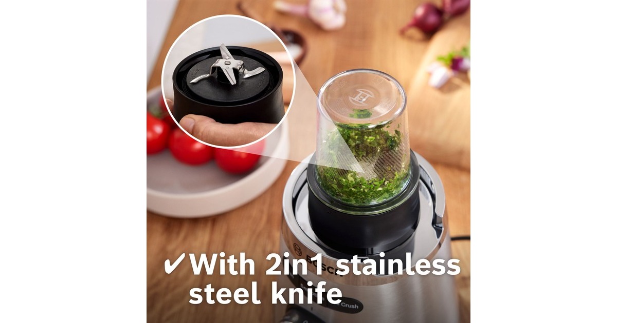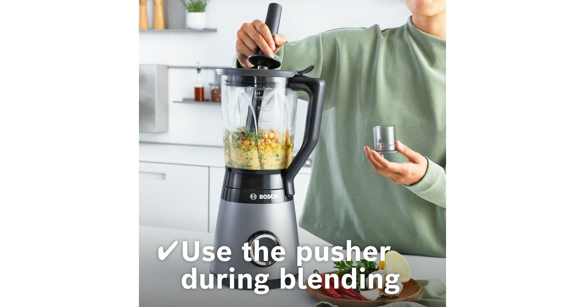 Der Bosch Standmixer VitaPower MMB6177S mit bruchsicherem Tritan-Mixbehälter mixt perfekte Smoothies sicher und einfach. Das Zubereiten von Crushed Ice oder festen Zutaten braucht einen starken Motor. Mithilfe des 1.200W Motors mit bis zu 30.000 U/Minute Motor-Leistung und den hochwertigen, rostfreien ProEdge Klingen können Getränke, Shakes oder Pesto reibungslos zubereitet werden. Für optimale Mixergebnisse und die richtige Konsistenz. Mit zwei Geschwindigkeiten und Pulsstufe lassen sich verschiedene Lebensmittel einfach zubereiten. Der dickwandige, hoch qualitative 1,5 Liter ThermoSafe Glasbehälter eignet sich ideal für die Zubereitung von heißen Suppen und eiskalten Getränken. Das Innere des Behälters besitzt speziell geformte FlowBooster Linien für eine optimale Bewegung der Zutaten im Behälter und einem daraus resultierenden ebenmäßigen Ergebnis. Wenn es mal schnell gehen soll, kann der Smoothie direkt in dem ToGo-Becher gemixt werden. Das spart Zeit sowie den Einsatz eines weiteren Behältnisses, da kein Umfüllen notwendig ist. Die Flasche hat 0,6 Liter Nutzvolumen und besteht aus BPA-freiem Tritan. Durch den SafeLock Tropfschutz, ein einzigartiger Sicherheitsmechanismus, wird verhindert, dass sich die Flasche versehentlich geöffnet wird und der Inhalt auf den Antriebsmotor ausläuft. Außerdem ist der Deckel der ToGo-Flasche auslaufsicher. Der inkludierte Universalzerkleinerer ist perfekt, um im Handumdrehen Zwiebeln, Knoblauch, Kräuter oder Hartkäse zu hacken. Zudem kann man Nüsse, Kaffeebohnen oder Pfefferkörner mahlen. Dank dem scharfen, rostfreien Edelstahlmesser mit vier Klingen werden alle Zutaten mühelos gemahlen oder zerkleinert. Die Reinigung ist dank der spülmaschinenfeste Teile ein Kinderspiel.