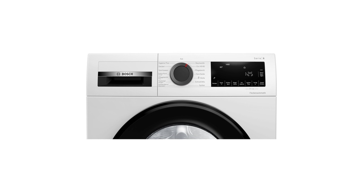 | Bedienung | Drehwähler, TouchControl-Tasten: Bügelleicht, Fertig in, Fleckenauswahl, Spülen Plus, Start / Pause mit Nachlegefunktion, Temperatur, SpeedPerfect, Vorwäsche, Drehzahlabwahl/Spülstop |