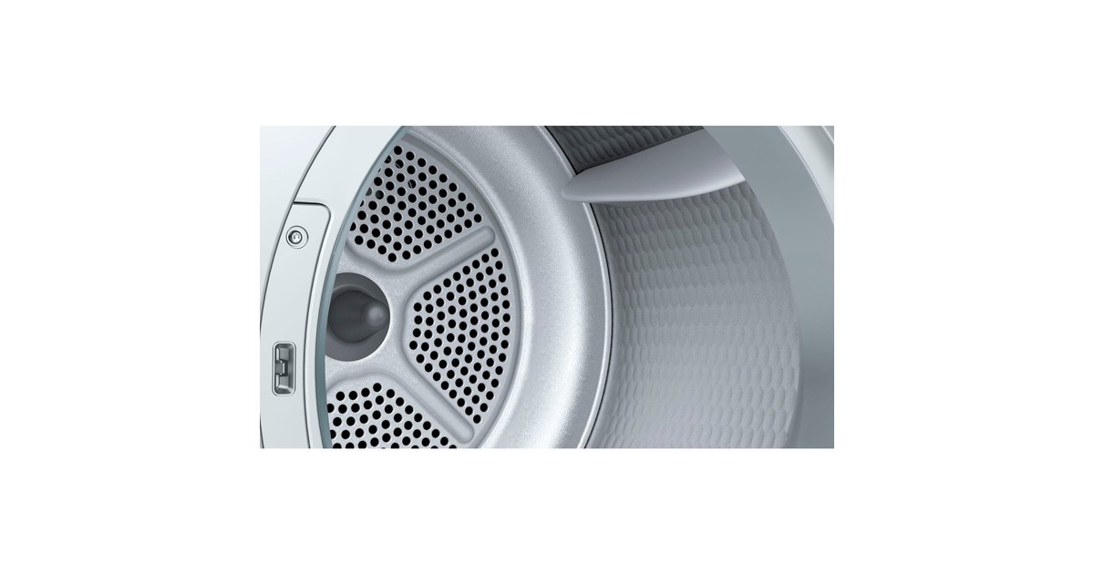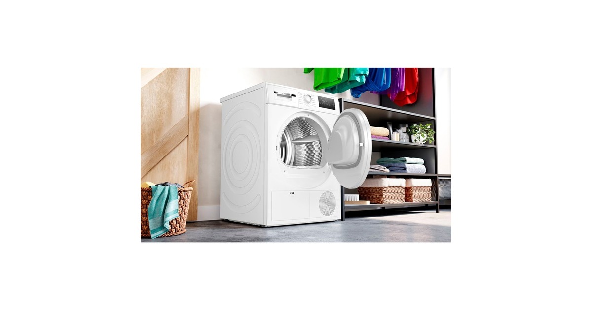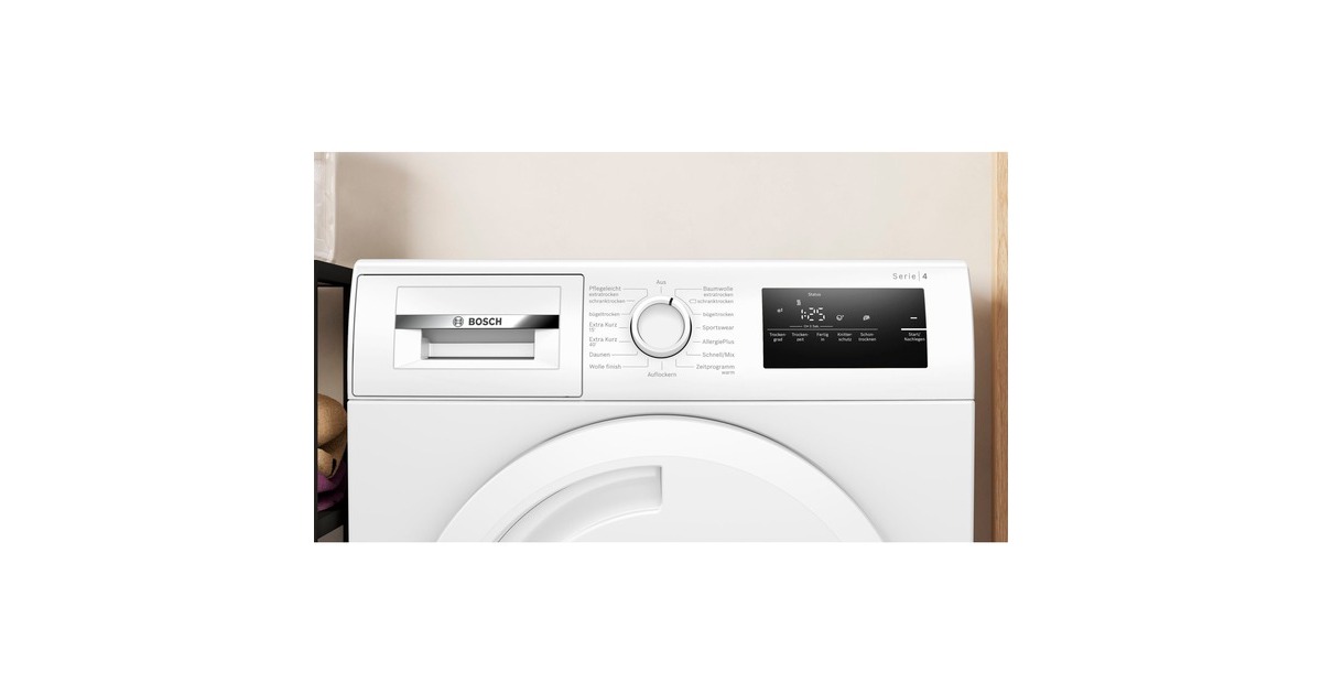 Der Bosch WTN83203 Serie 4 Kondensationstrockner bietet eine Nennkapazität von 8 kg Baumwolle und eine Energieeffizienzklasse B (A+++ - D) bei einem jährlichen Verbrauch von 560 kWh. Der Trockner ist in Weiß erhältlich und verfügt über LCD-Tasten zur Bedienung sowie eine Startzeitvorwahl. Das Display zeigt den Programmablauf an und informiert über volle Behälter oder gereinigte Siebe. Mit verschiedenen Programmen wie Allergie Plus/Hygiene, Daunenbekleidung, Mix, Shirts 15, Sportswear, Super 40, Wolle Finish sowie Zeitprogramm kalt/warm bietet dieser Trockner zahlreiche Optionen für unterschiedliche Materialien und Anforderungen. Ein Signal am Ende des Programms ist sowohl akustisch als auch optisch, während die Knitterschutzfunktion Faltenbildung reduziert. Das Gerät ist ein Frontlader mit rechtem Türanschlag und der Trockner ist säulenfähig für platzsparende Montage im Zuhause. Besondere Features wie die Nachlegefunktion und der Feuchtigkeitssensor machen den Bosch WTN83203 Serie 4 zu einem praktischen und benutzerfreundlichen Trockner mit hoher Leistungsfähigkeit.Art.-Nr.: 100022028