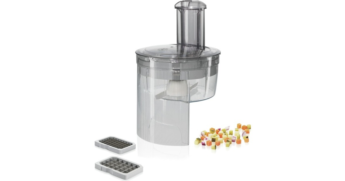 Mit dem Würfelschneider MUZ5CC2 von Bosch lassen sich Fleisch, Kartoffeln, Gemüse und Obst in gleichmäßig große Würfel schneiden. Das ist besonders praktisch bei großen Mengen z.B. bei Familienfesten. Durch die zwei unterschiedlichen Einsätze sind zwei Würfelgrößen (0,9cm x 0,9cm und 1,3cm x 1,3cm) wählbar. Der beigefügte Gitterreiniger erleichtert die Reinigung.Art.-Nr.: 1360248