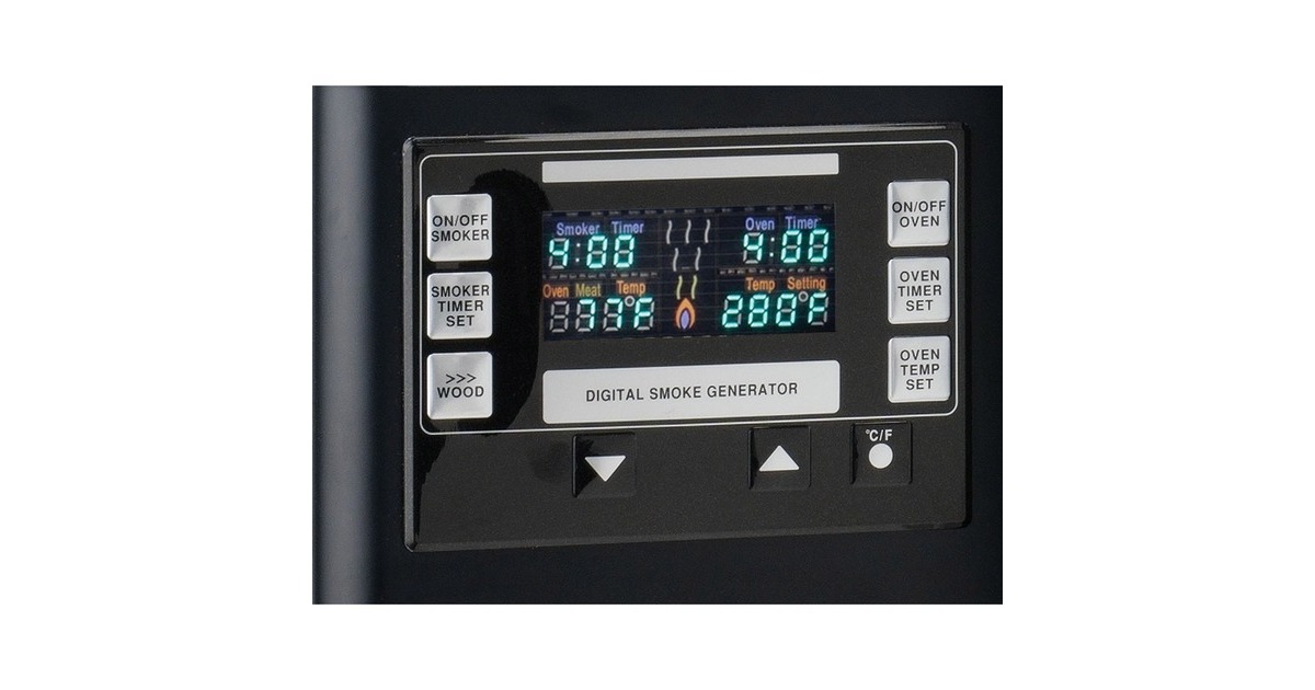 Digitalanzeige, programmierbares Display, 3 separate Funktionen einstellbar: Ofentemperatur (wird automatisch gehalten), Garzeit (nach Ablauf der Zeit schaltet sich das Heizelement ab), Räucherzeit (unabhängig von der Garzeit) |