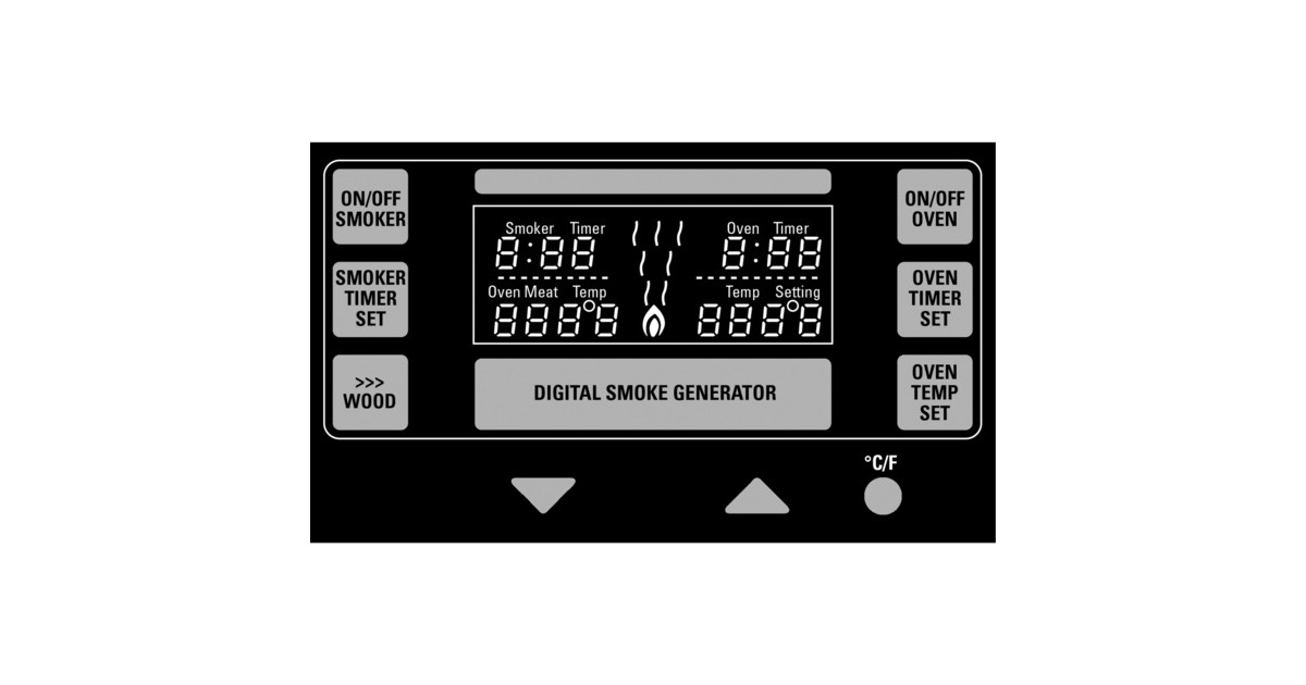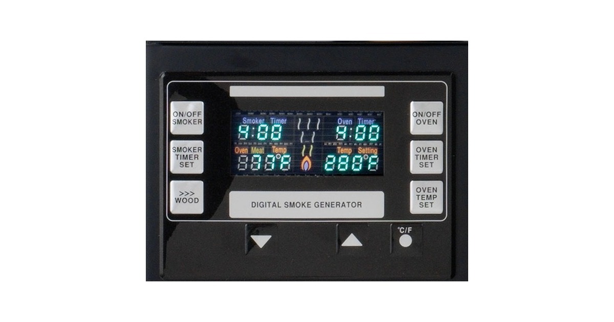 Digitalanzeige, programmierbares Display, 3 separate Funktionen einstellbar: Ofentemperatur (wird automatisch gehalten), Garzeit (nach Ablauf der Zeit schaltet sich das Heizelement ab), Räucherzeit (unabhängig von der Garzeit) |