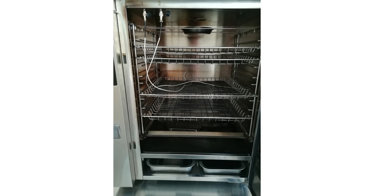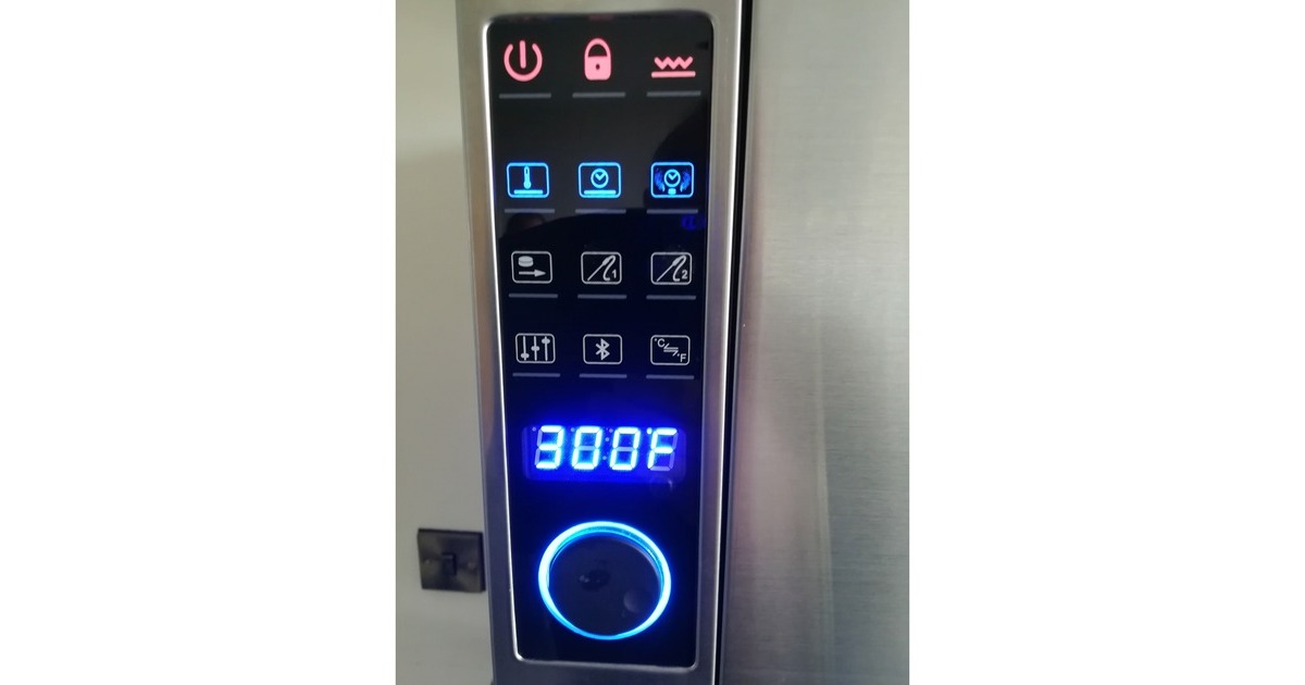 Touchscreen, USB-Anschluss zum Einlesen von Rezepten, Ofentemperatur (wird automatisch gehalten), Garzeit (nach Ablauf der Zeit schaltet sich das Heizelement ab), Räucherzeit (unabhängig von der Garzeit) |