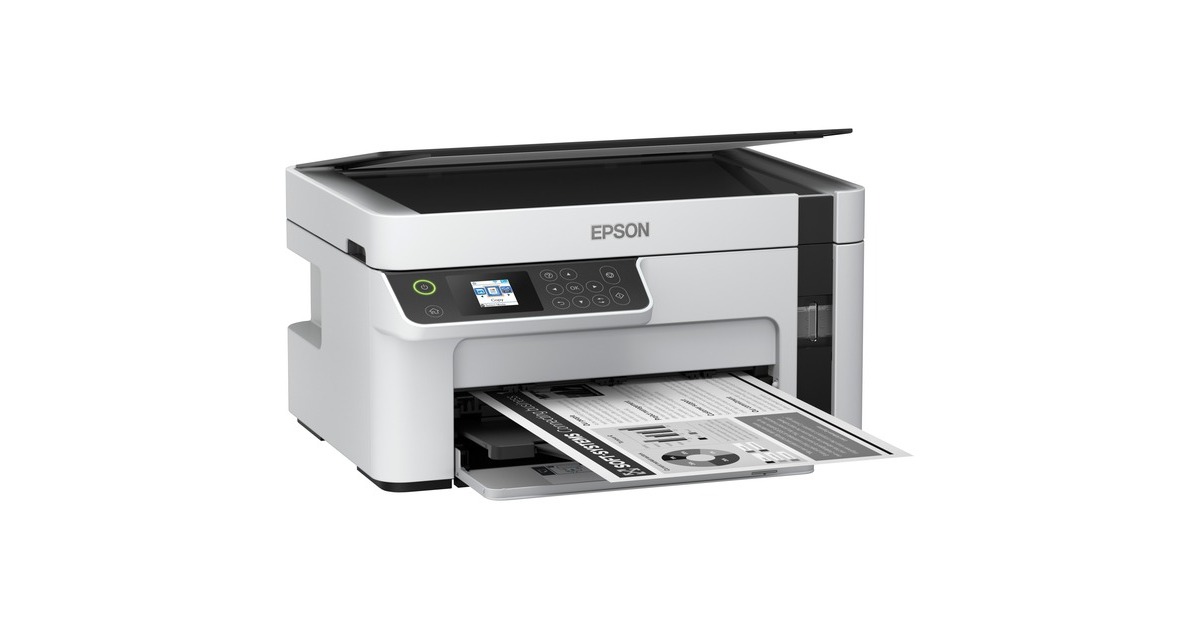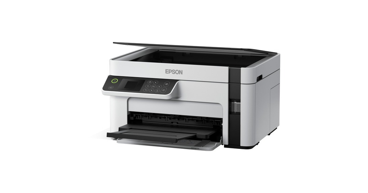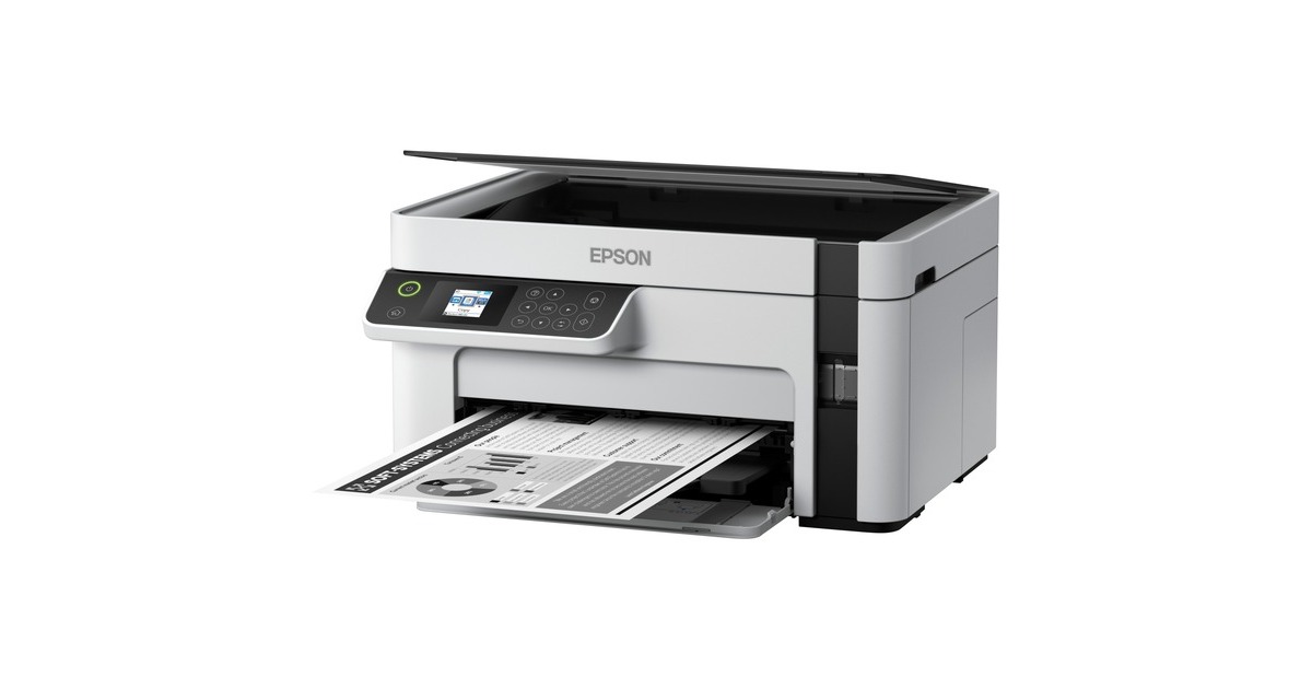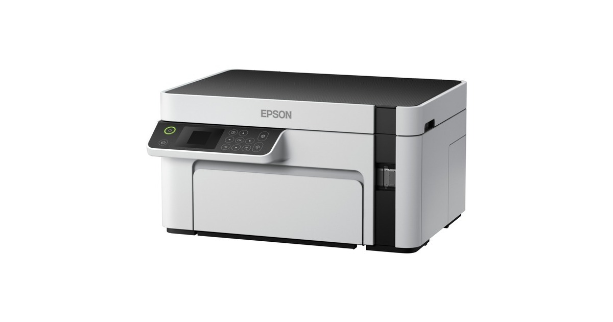 Günstige Druckkosten und drei Funktionen: Der EcoTank ET-M2120 von Epson ist ein innovativer Multifunktionsdrucker für kleine Arbeitsgruppen oder das Homeoffice. Er verfügt über einen großen, nachfüllbaren Tintentank - statt Patronen wird nun direkt Tinte eingefüllt, was die Druckkosten erheblich senkt. Mit im Lieferumfang dieses Geräts, das neben der Schwarzweiß-Druckfunktion auch einen Flachbettscanner und eine Kopierfunktion bietet, ist bereits Tinte für bis zu 5000 Seiten. Der ET-M2120 kann per USB an einen PC angeschlossen oder per WLAN in ein Netzwerk integriert werden.Art.-Nr.: 1616584