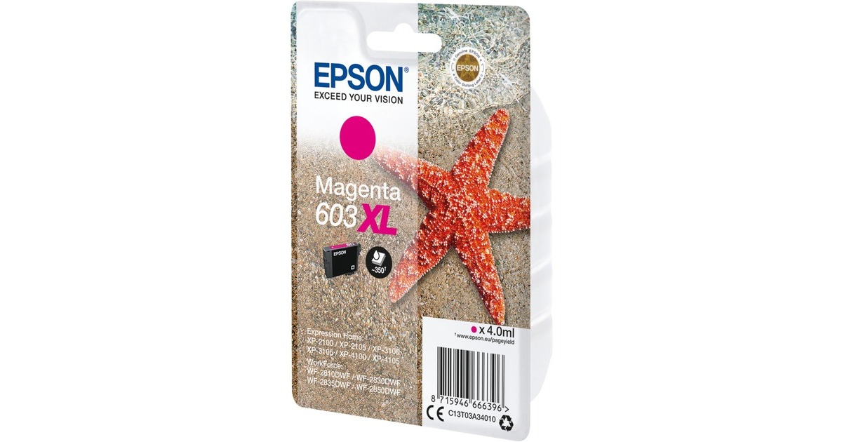 Die Original-Tintenpatrone 603XL (C13T03A34010) von Epson liefert überzeugende Druckergebnisse bei überschaubaren Kosten. Diese Patrone enthält 4 ml magentafarbene Tinte und erreicht eine Reichweite von bis zu 350 Seiten. Sie ist für verschiedene Drucker der Serien WorkForce und Expression Home geeignet. Art.-Nr.: 1634631