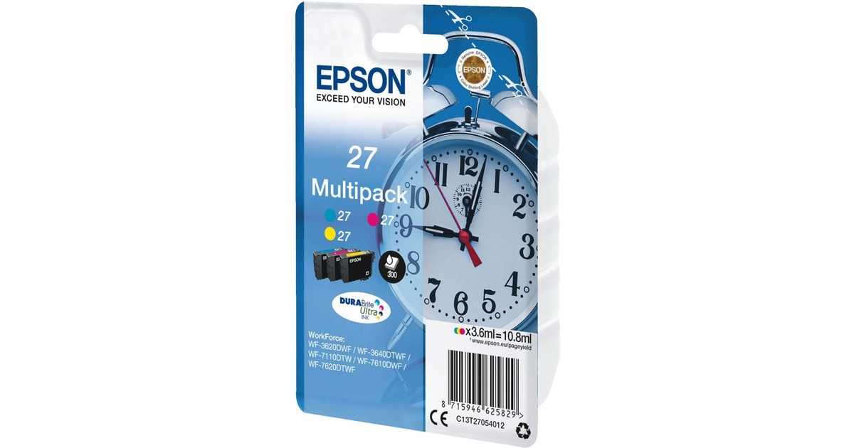 Das Multipack 27 (C13T27054012) enthält drei Epson-Patronen in den Farben cyan, magenta und gelb. Es ist kompatibel zu verschiedenen Druckern der Workforce-Serie. Diese Tinte ist mit DURABrite Ultra-Technik besonders für den Druck von laserscharfen Geschäftsdokumenten ausgelegt. Die Ausdrucke sind wisch- und wasserfest und können sofort mit einem Textmarker bearbeitet werden. Da die Tinte sehr schnell trocknet, ist sie besonders für den beidseitigen Druck geeignet.Art.-Nr.: 1341257
