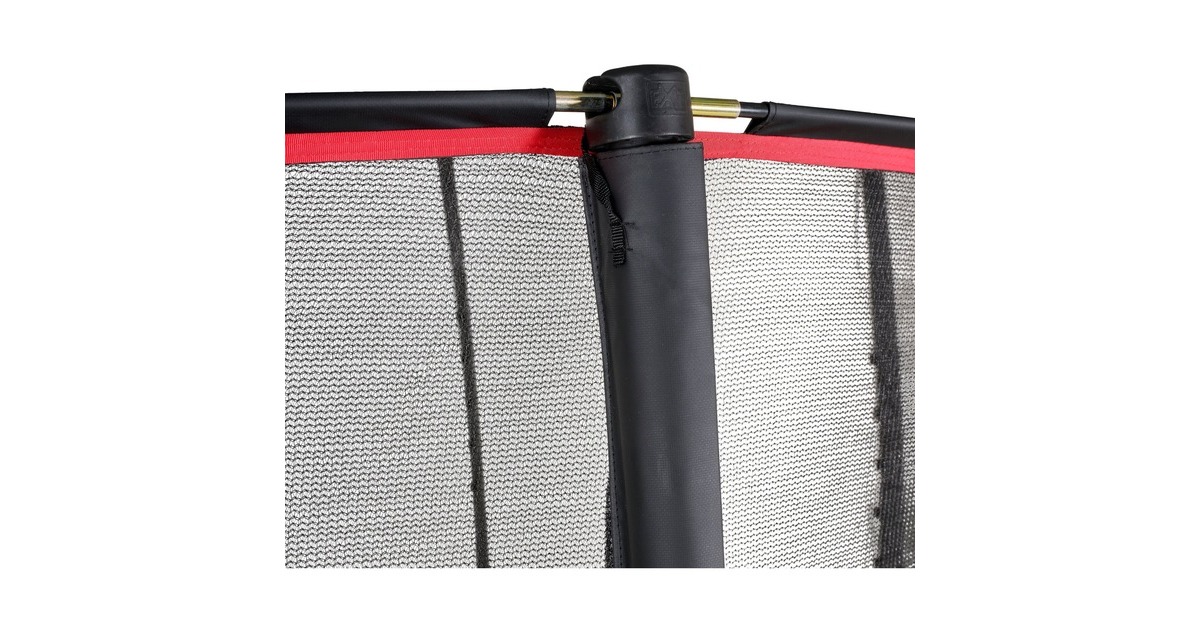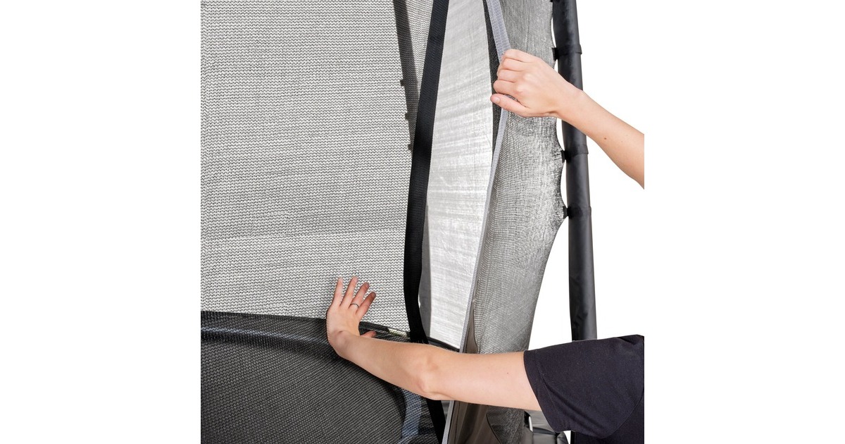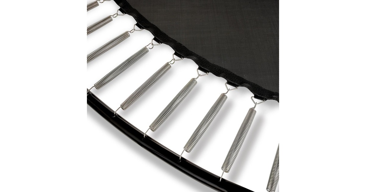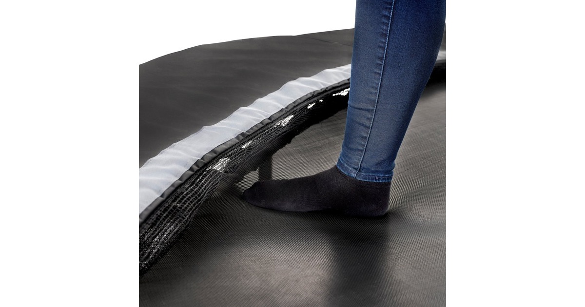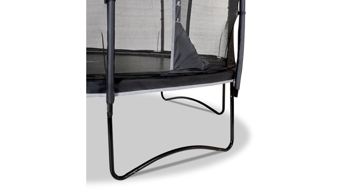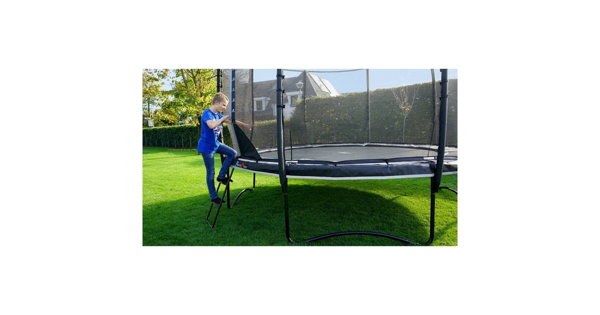 64 doppelkonische Federn, galvanisiert | Schutzrand mit 45 cm Breite, Dicke 30 mm | Sicherheitsnetz mit überlappender Tür, Sprungmesser und einer Höhe von 198 cm | Schaumstoff-Schutz an den Netzpfosten | schwarze Leiter mit einer Höhe von 99 cm und einer Breite von 41 cm, 2 Tritte, Anti-Rutsch-Beschichtung |