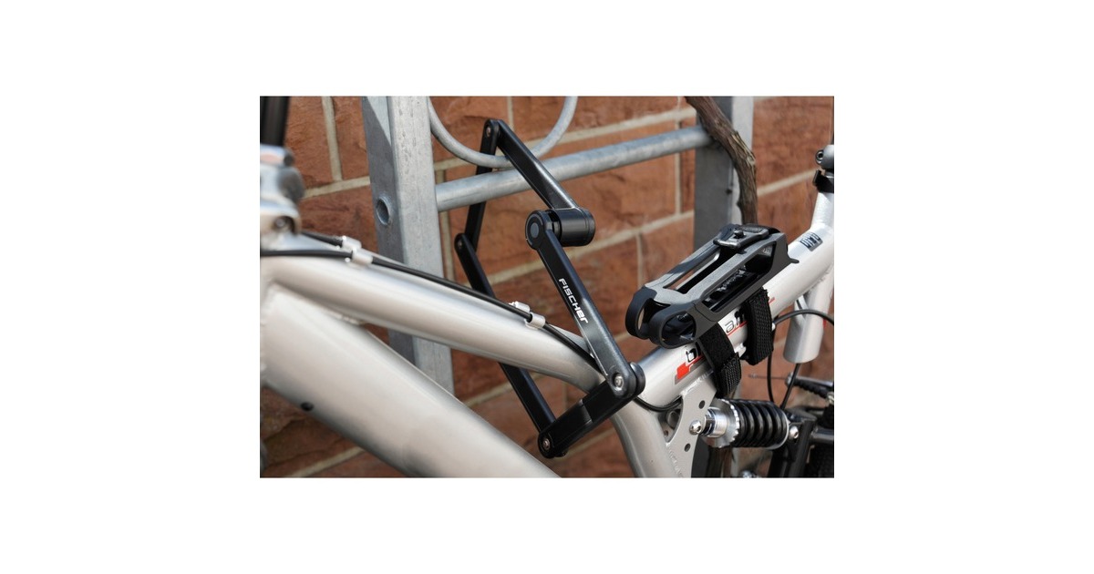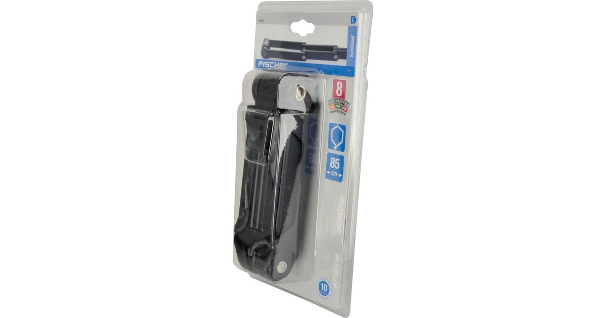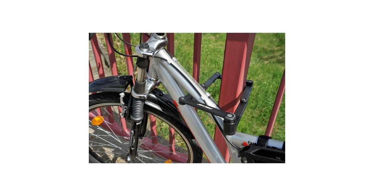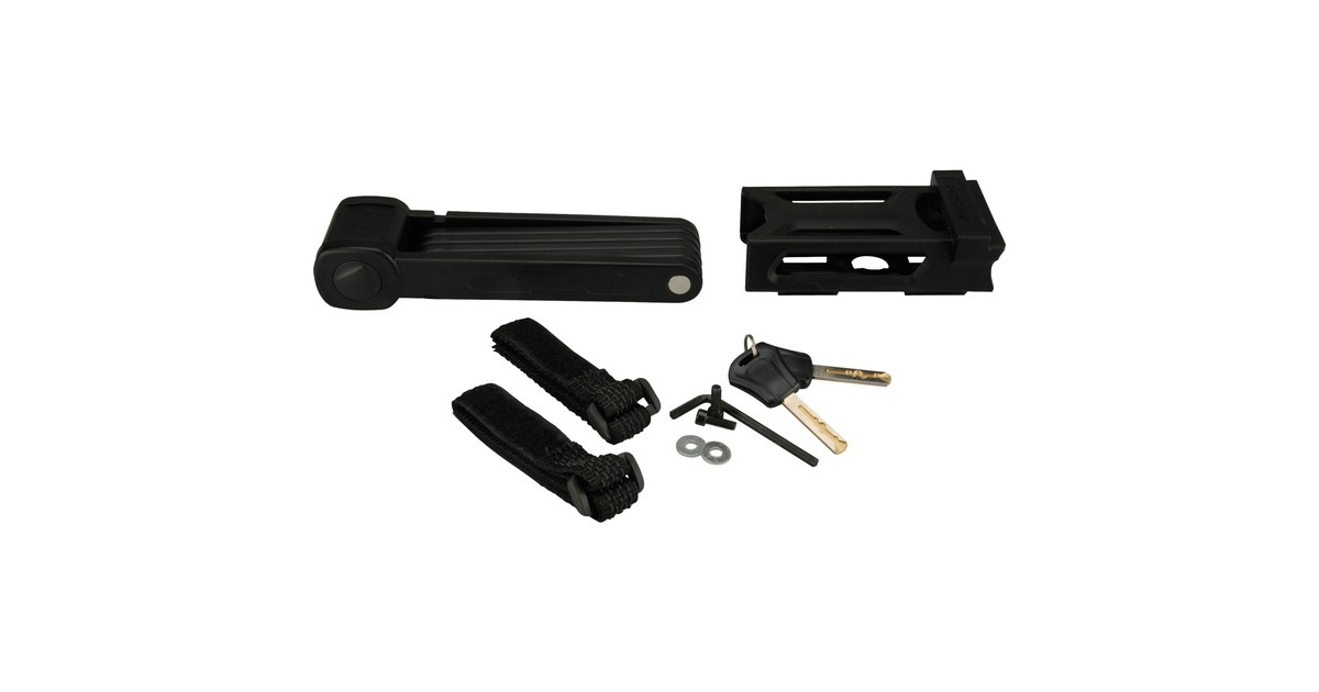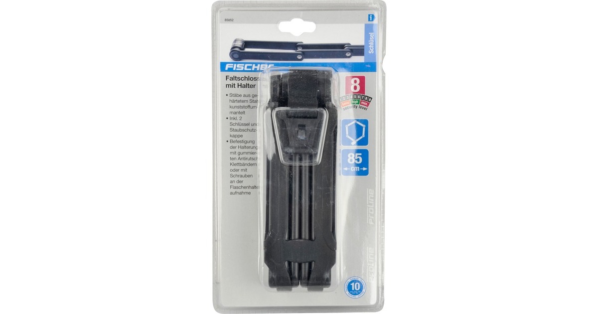Das praktische Faltschloss kann für den Transport am Fahrradrahmen befestigt werden. Dafür legt man den Halter mit rutschfesten Klettbändern an. Das Schloss ist, komplett entfaltet, 85 cm lang und aus gehärtetem Stahl gefertigt und mit einer Kunststoffummantelung versehen.Art.-Nr.: 1398574