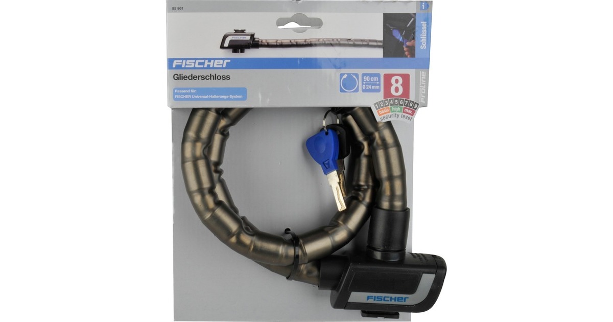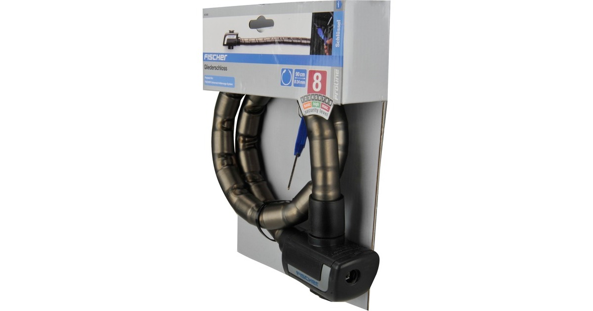 Das Gliederschloss von Fischer besteht aus einem hoch festen Panzerseil, dass mit Gelenkkapselungen aus Spezialstahl verstärkt ist. Der Schließkörper ist abgedeckt um zu verhindern das Schmutz eindringen kann. Über das beiliegende Klettband kann das Schloss einfach und sicher am Fahrrad transportiert werden. Der beleuchtete Schlüssel mach das Öffnen des Schlosses bei schlechtem Licht besonders einfach.Art.-Nr.: 1398509