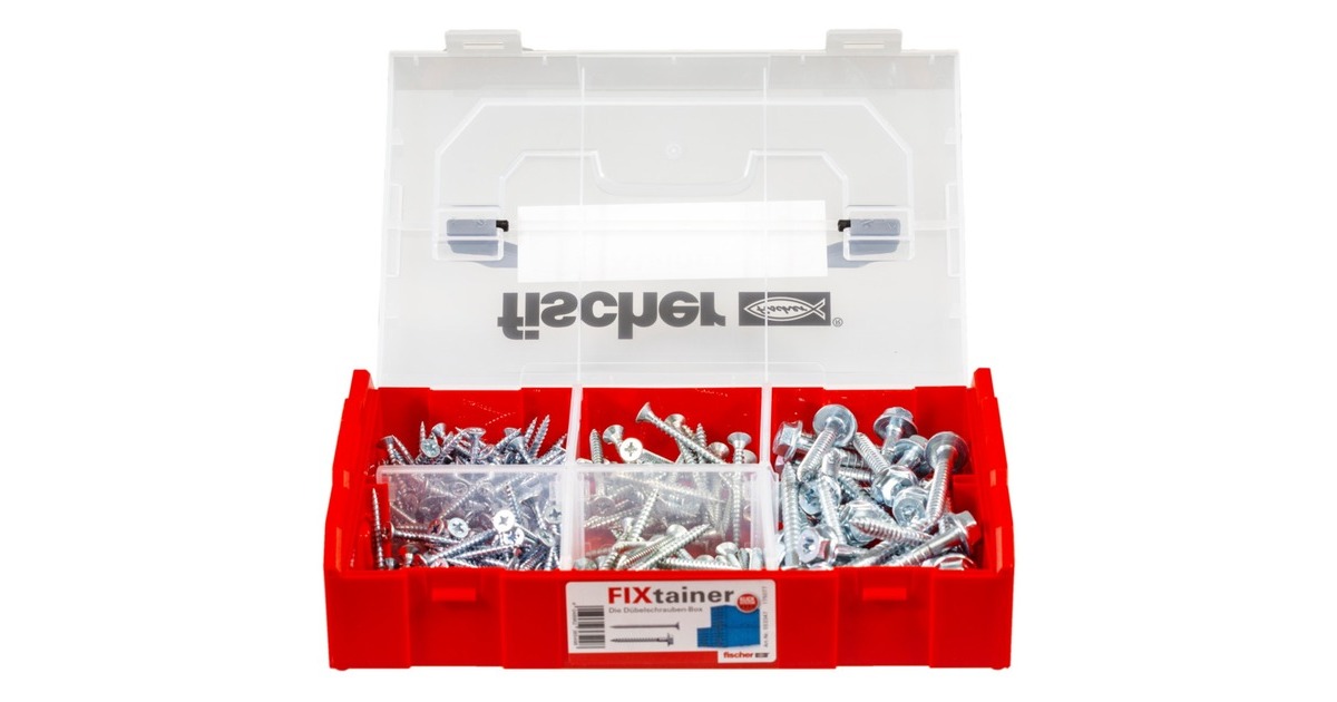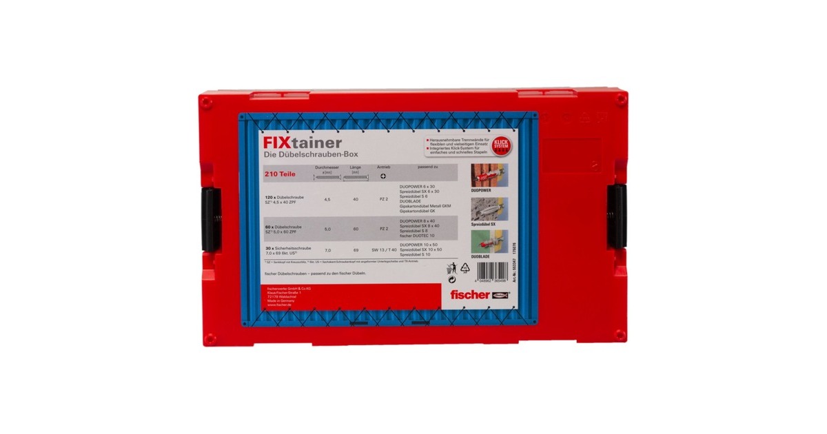 Der fischer FixTainer mit Dübelschrauben-Sortiment enthält vorsortiert 180 Senkkopfschrauben mit PZ2-Antrieb in zwei unterschiedlichen Größen sowie 30 Sicherheitsschrauben mit angepresster Unterlegscheibe. Die enthaltenen Dübelschrauben sind optimal auf die gängigen fischer Dübel wie DUOPOWER, SX und S mit den Durchmessern 6, 8, und 10mm sowie DUOBLADE Gipskartondübel GK und Gipskartondübel Metall GKM abgestimmt. In Verbindung mit den Dübeln eignen sich die Schrauben z.B. zum Anbringen von TV-Konsolen, Leuchten, leichten Spiegelschränken, Dunstabzugshauben, Briefkastenanlagen, Bildern, Fensterrollos, Gardinenschienen, Waschtischbefestigungen, Sanitär-/ Heizung-/ Klima-Befestigungen oder Bad- und WC-Einrichtungen.Art.-Nr.: 1701503