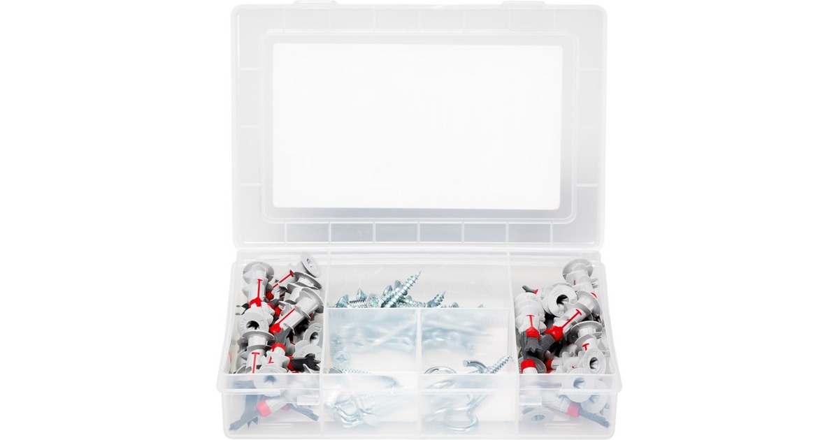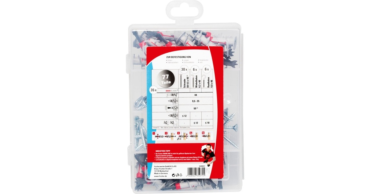 Der fischer Gipskartondübel DUOBLADE S ist aus hochwertigem Nylon gefertigt. Der fischer DUOBLADE S ist ein Mitglied der hochdekorierten DUO-Line und besteht aus mehreren Komponenten für bestmögliche Performance. Die selbstbohrende Bohrspitze ermöglicht einen sauberen und effektiven Bohrvorgang ohne ein Verlaufen des Dübels. Der Dübel wird in der Vorsteckmontage mit einem Akku-Schrauber oder Schraubendreher oberflächenbündig in Gipskarton oder Gipsfaserplatten eingedreht. Der DUOBLADE S ist abgestimmt auf Holz-, Blech- und Spanplattenschrauben von 4 bis 5mm Stärke sowie unterschiedlichen Haken und Ösen. Dadurch ist er universell geeignet, um z.B. Rauchmelder, Vorhangstangen und Jalousien sicher und schnell zu befestigen. Die aus hochwertigem und schlagfestem Kunststoff gefertigte Meister-Box ist ideal für Werkstatt und Baustelle. Der transparente Deckel ermöglicht die Übersicht auf einen Blick. Die fischer Meister-Box lässt sich fest verschließen und kann wieder mit Dübeln befüllt werden.Art.-Nr.: 1700242