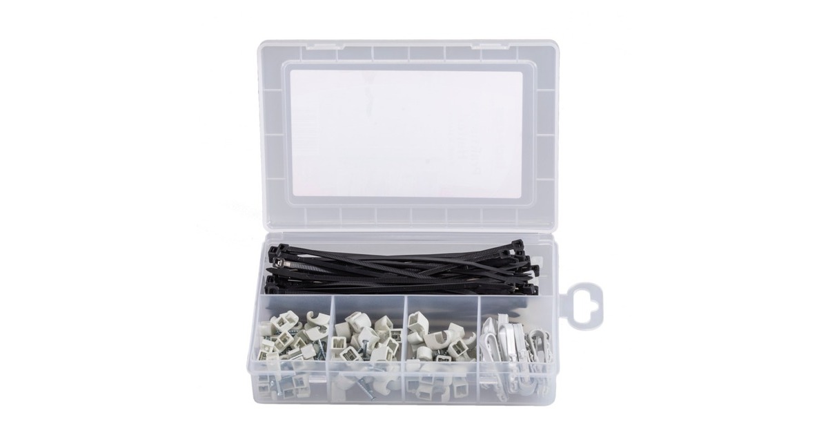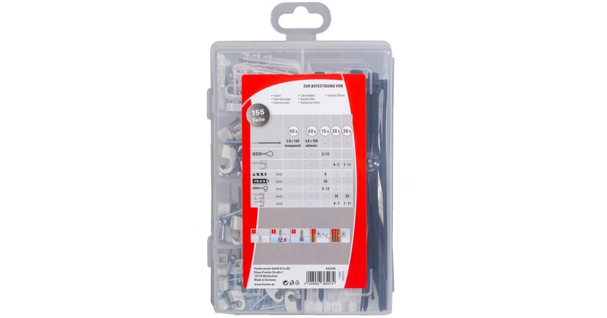 30x Mehrbereichsnagelschelle MNS 4-7 mit vormontiertem Nagel, 30x Mehrbereichsnagelschelle MNS 7-11 mit vormontiertem Nagel, 15x Leitungsschlaufe SF plus LS 3/13, 40x Kabelbinder BN 3,6 x 150 transparent, 40x Kabelbinder BN 3,6 x 150 schwarz |