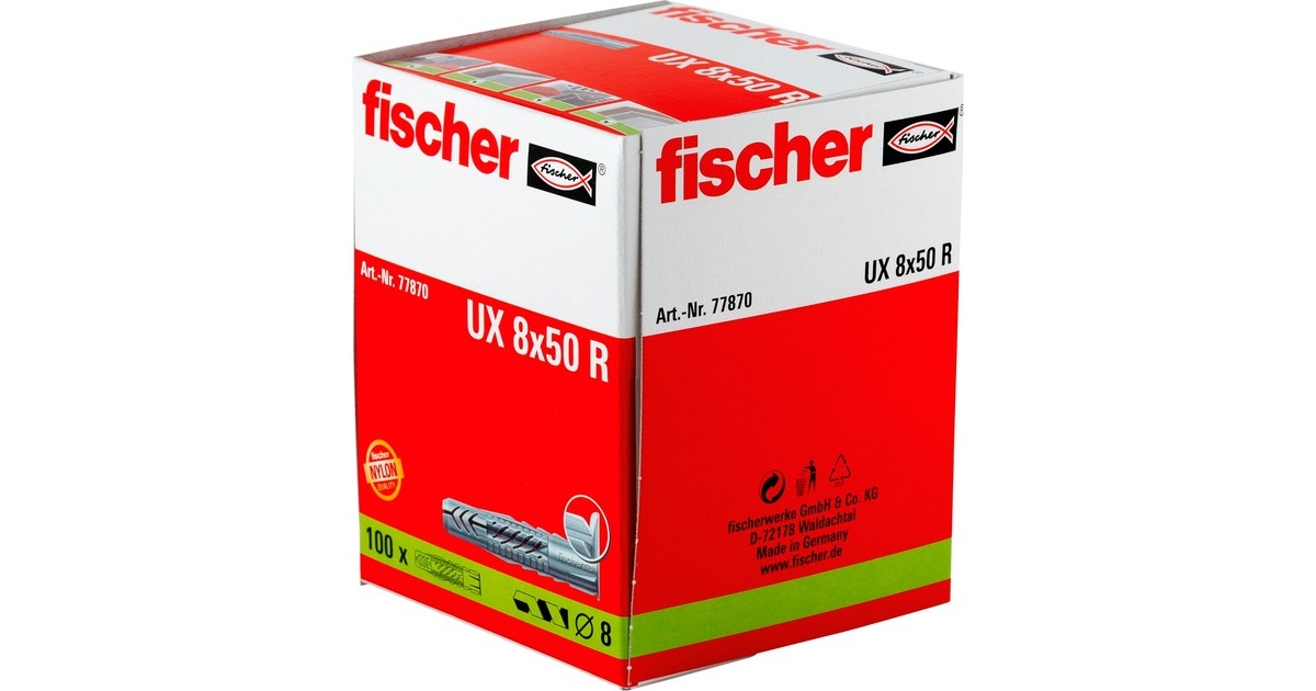 Der fischer Universaldübel UX 8x50 R aus hochwertigem Nylon verspreizt in Vollbaustoffen und verknotet in Hohl- und Plattenbaustoffen für maximalen Halt. Damit ist er immer die richtige Wahl, auch bei einem unbekannten Baustoff. Der Rand verhindert ein Tieferrutschen bei der Montage. Die schrägen Verbindungsstege sorgen für eine optimale Schraubenführung und die sägezahnförmigen Verdrehsicherungen verhindern das Mitdrehen des Dübels im Bohrloch. Dadurch wird eine größtmögliche Montagesicherheit erreicht. Der fischer Universaldübel UX 8x50 R ist z.B. für die Befestigung von Leuchten, Handtuchhaltern, Bildern oder leichten Spiegelschränken zu empfehlen.Art.-Nr.: 1791345